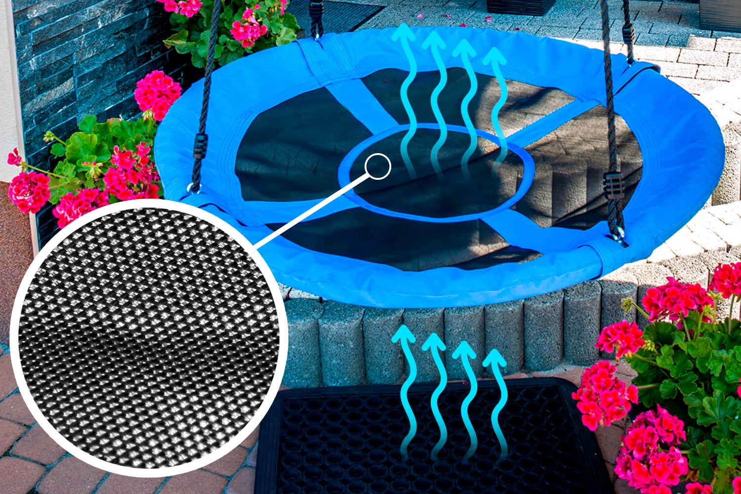 Гніздо має регульовані мотузки, сидіння та металевий каркас, оббитий поролоном. Мотузки оснащені металевими кільцями для установки, а завдяки їх регулюванню гойдалки можна підлаштувати під зріст дитини. Міцні гойдалки також стануть чудовою розвагою для дорослих.