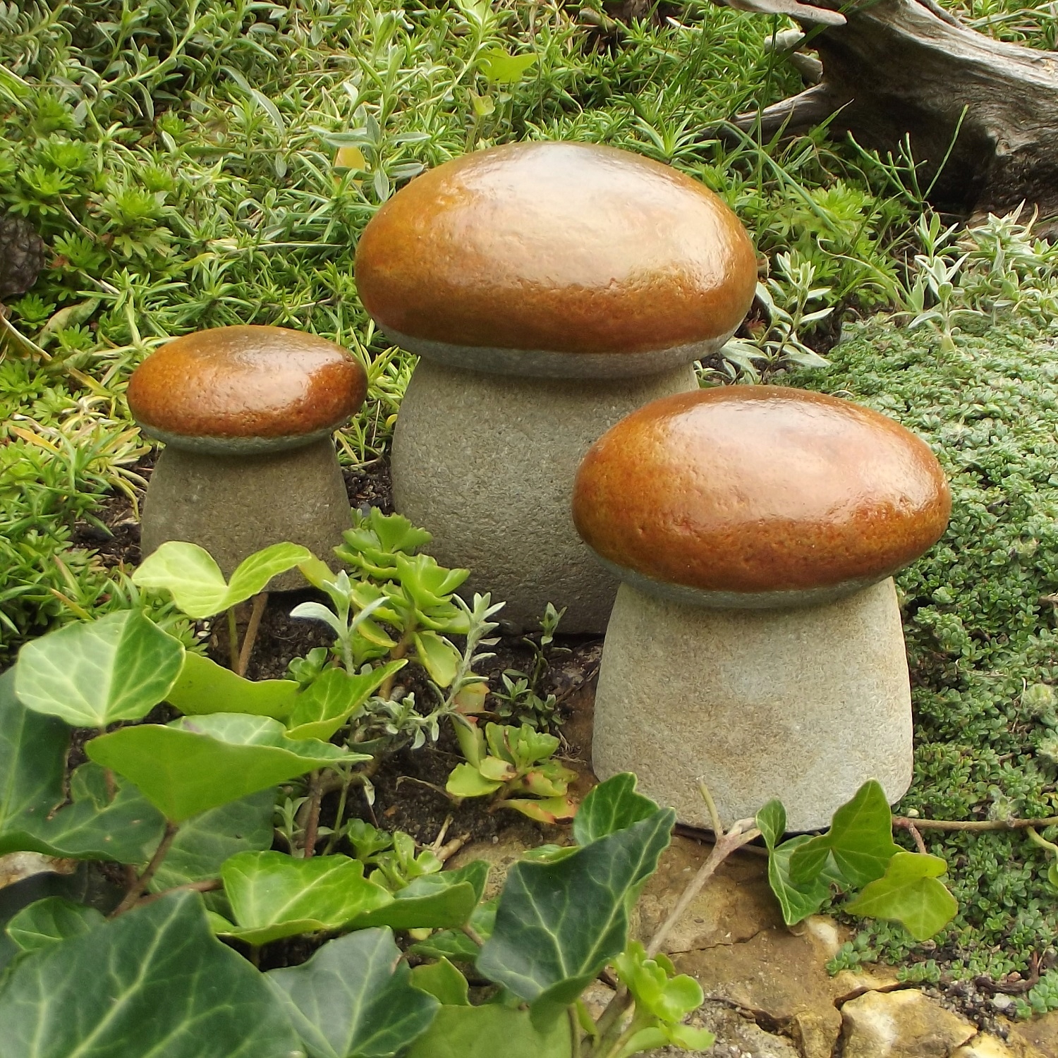 Набір із трьох однакових садових грибів із натурального каменю. Фігурки стійкі до погодних умов. Ідеальна прикраса для альпінарію, клумби або під хвойні рослини. Кожен набір дещо відрізняється, тому що він виготовлений з натуральної гальки.
