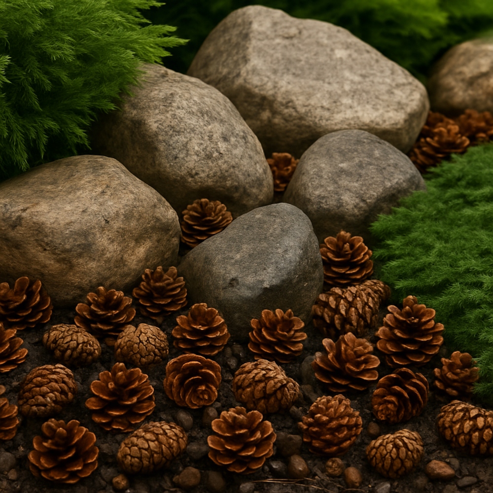 розповсюджуйте шишки між більшими каменями (габіонами, декоративними скелями), створюючи природний перехід між твердим ландшафтом та рослинністю.