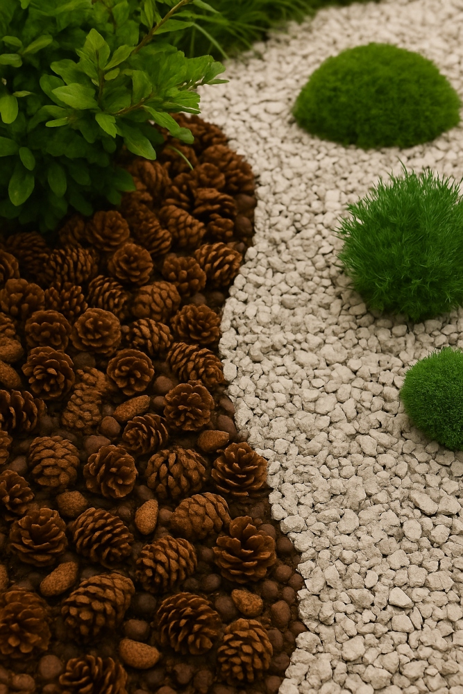 розповсюджуйте шишки між більшими каменями (габіонами, декоративними скелями), створюючи природний перехід між твердим ландшафтом та рослинністю.