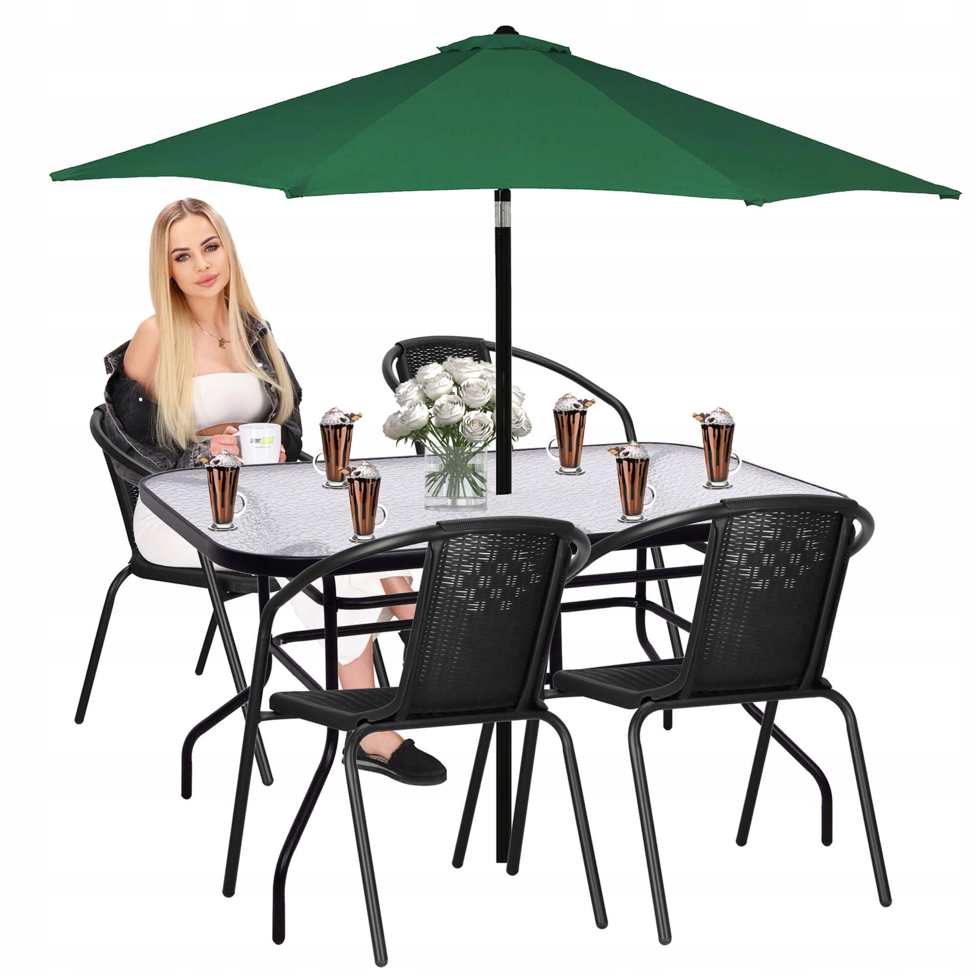 У центральній частині таблиці є характеристика notch , що використовується як місце для парасольки . Крім того, садовий стіл завдяки скляній стільниці полегшує збереження чистоти. Висока якість виготовлення робить її стійкою до різних несприятливих погодних умов.