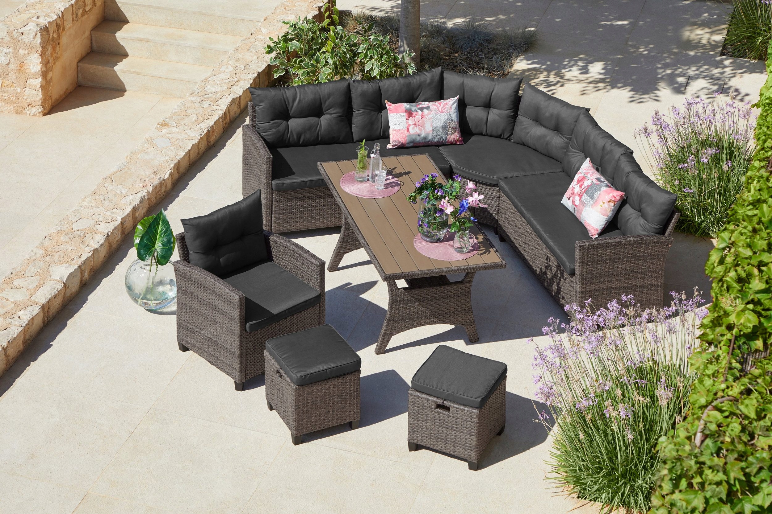 Немає нічого зручнішого за це! Konifera "Keros Premium" набору з простором для максимум 8 людей створюється для приємних літніх вечорів під яскравим, зоряним небом. 20-частинний набір садових меблів, виготовлений з поліграфа в кольорі антрациту, складається з куточка для сидіння, двох табуретів, крісла та столу з розмірами 145x75 см. Тихо м'які подушки сидіння забезпечують довгостроковий комфорт сидіння, а сполучні кліпи забезпечують стабільну узгодженість окремих елементів сидіння.