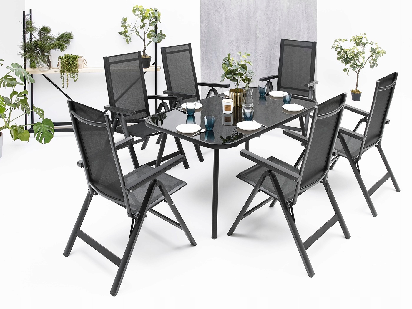 КОМПЛЕКТ САДОВИХ МЕБЛІВідеально підходить для вашого саду. Рама має подвійне порошкове покриття, що ідеально підходить для використання як усередині, так і на вулиці. Сидіння та спинка стільця виготовлені з чорної гнучкої текстильної оббивки для максимального комфорту. Має дві бічні спинки з композитних плит WPC. Використані матеріали не вимагають частого догляду, стійкі до погодних умов і не потребують спеціальних засобів догляду. Ніжки додатково оснащені пластиковими накладками. Стіл має стільницю з чорного загартованого скла. 5 мм.
