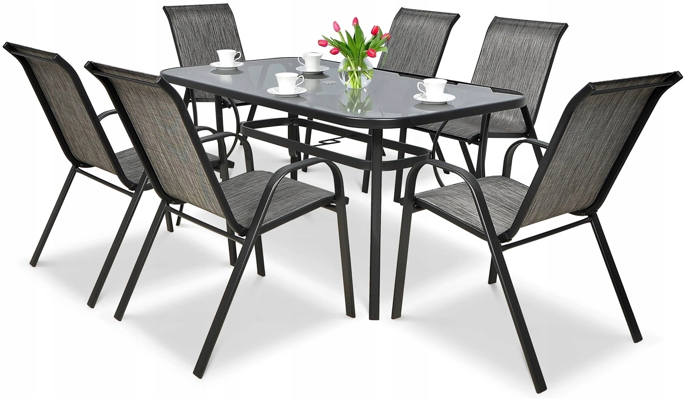 Радимо вам придбати великий і зручний садовий набір BOLOGNA 150/6 сірого кольору. Цей елегантний набір складається з 6 стільців і прямокутного столу, створюючи ідеальний простір для спільної трапези на відкритому повітрі. Конструкція виконана зі сталі антрацитового порошкового покриття, що забезпечує довговічність і стійкість до погодних умов.