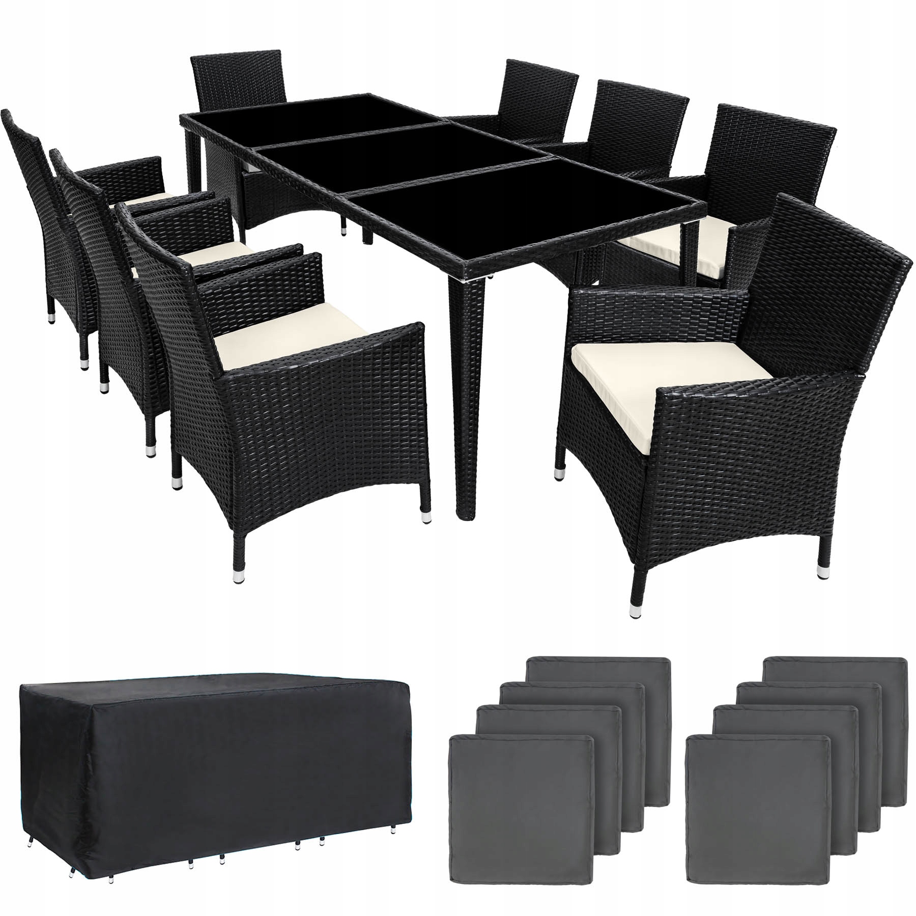 Завдяки нашому зручному та елегантному комплекту садових меблів з техноротангу, проведення часу на природі стане справжньою насолодою. Завдяки невеликій вазі меблі легко транспортуються. З іншого боку, алюмінієві рами дуже стійкі. Поверхня столу з 3 скляними елементами виглядає дуже елегантно і легко миється. Дуже зручні бежеві поліестерові сидіння під колір меблів; Вони застібаються ззаду на блискавку, завдяки чому оббивку легко чистити. Щоб захистити подушки від вологи, поверхня наволочок була просочена, тому бруд і краплі води просто стікають.