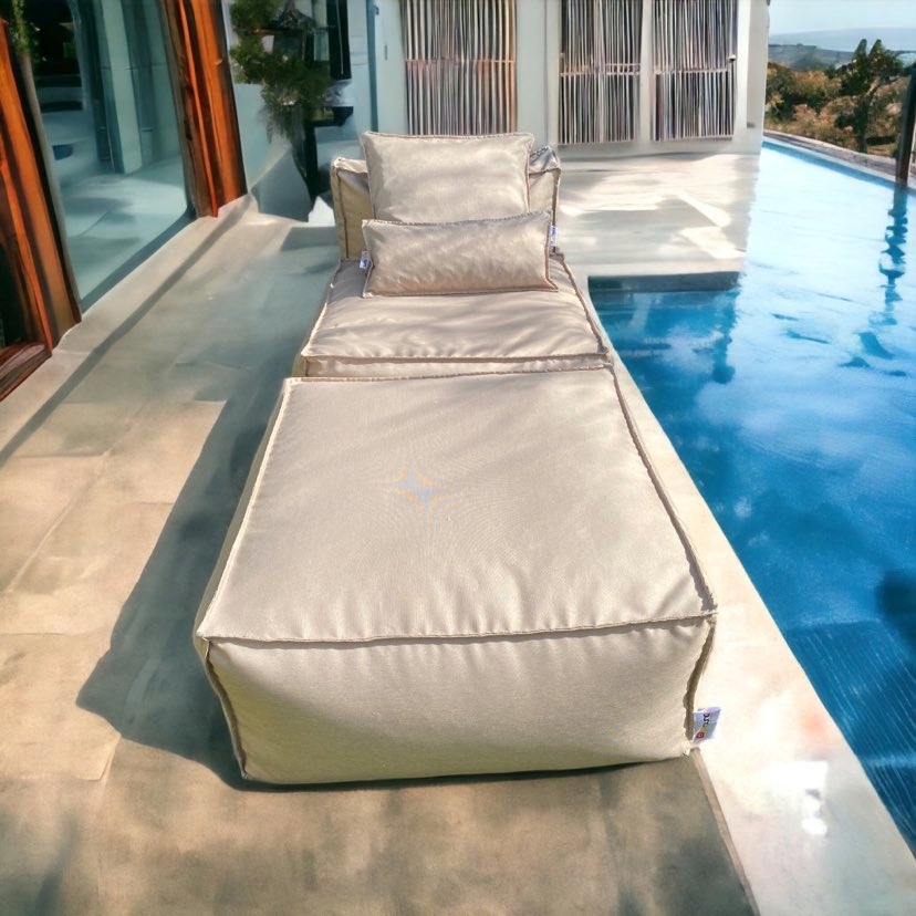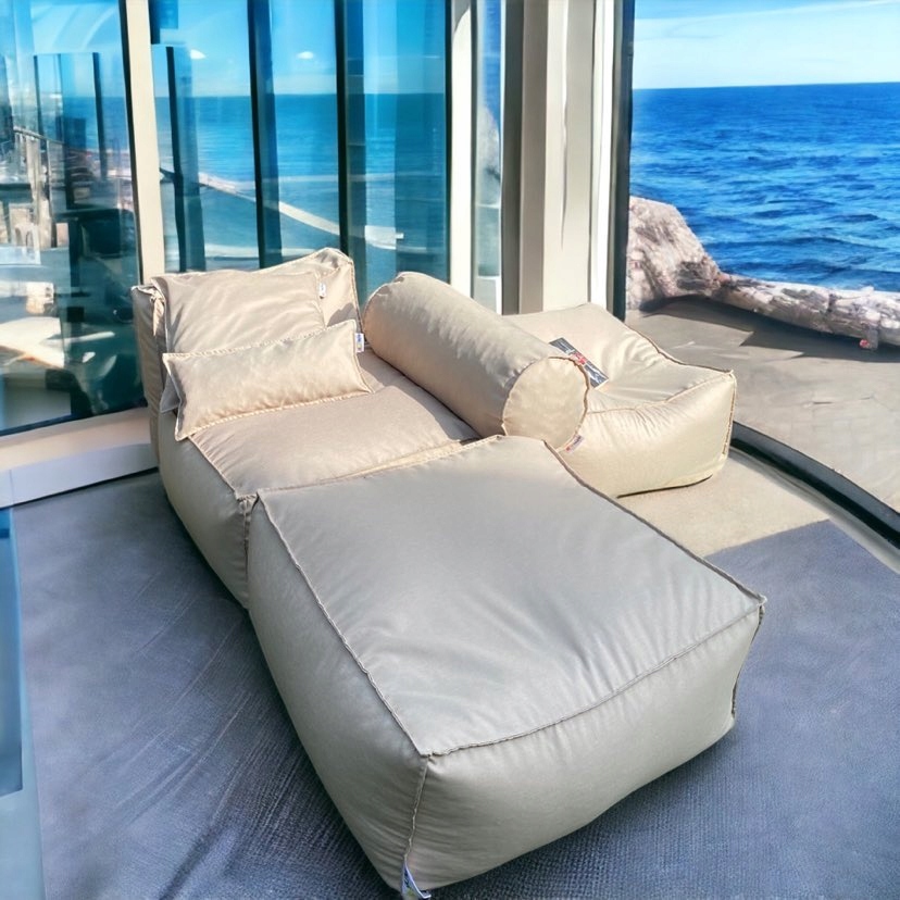 лежак або Диван виготовлений з лляної поліефірної тканини з водонепроникними властивостями, всередині гранульований пінополістирол. Зшиваємо все міцними подвійними стібками. Завдяки такому пошиттю ми можемо бути впевнені, що крісло прослужить довго, а вставка не розсиплеться.Його естетичні цінності та міцна конструкція обумовлені продуманою конструкцією та використанням високоякісних матеріалів. матеріали, подвійне кріплення та подвійні шви.