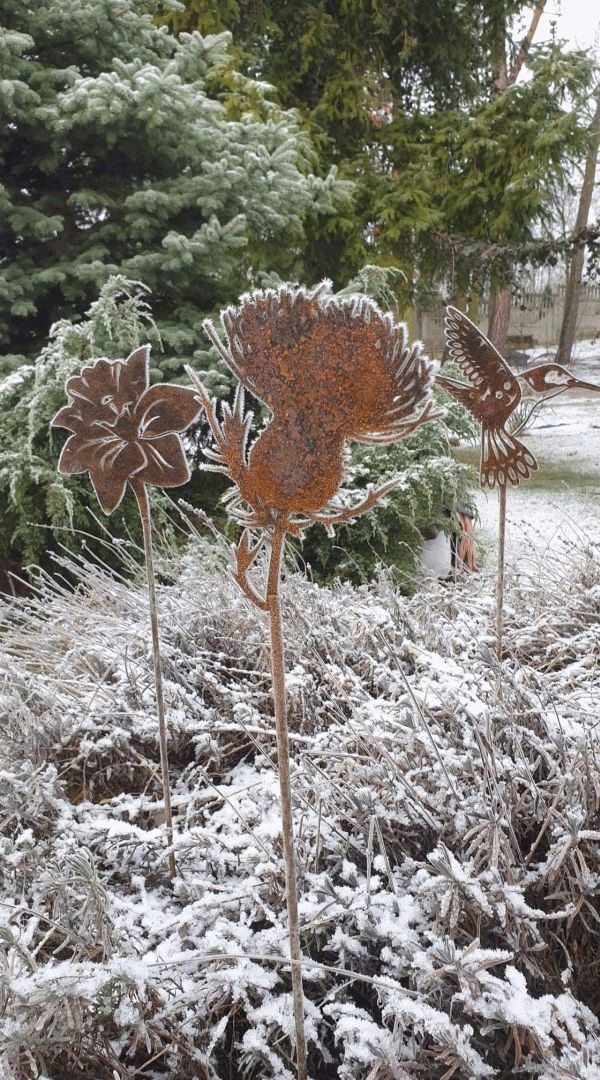 Ці прикраси виготовлені з кортенової сталі, яка з часом стає красивою колір іржі під впливом погодних умов колір. Садові декорації не вимагають догляду, оскільки завдяки сталі, яка використовується у їх виготовленні, вони стійкі до погодних умов і протягом тривалого часу піддаються повільній корозії. Ми прискорюємо процес іржавіння за допомогою препарату, призначеного для цієї мети, але пам’ятайте, що очікуваний кінцевий ефект іржавіння буде досягнутий лише з часом. Фактура та колір декору є результатом природного процесу корозії та може відрізнятися від зображеного на фото.