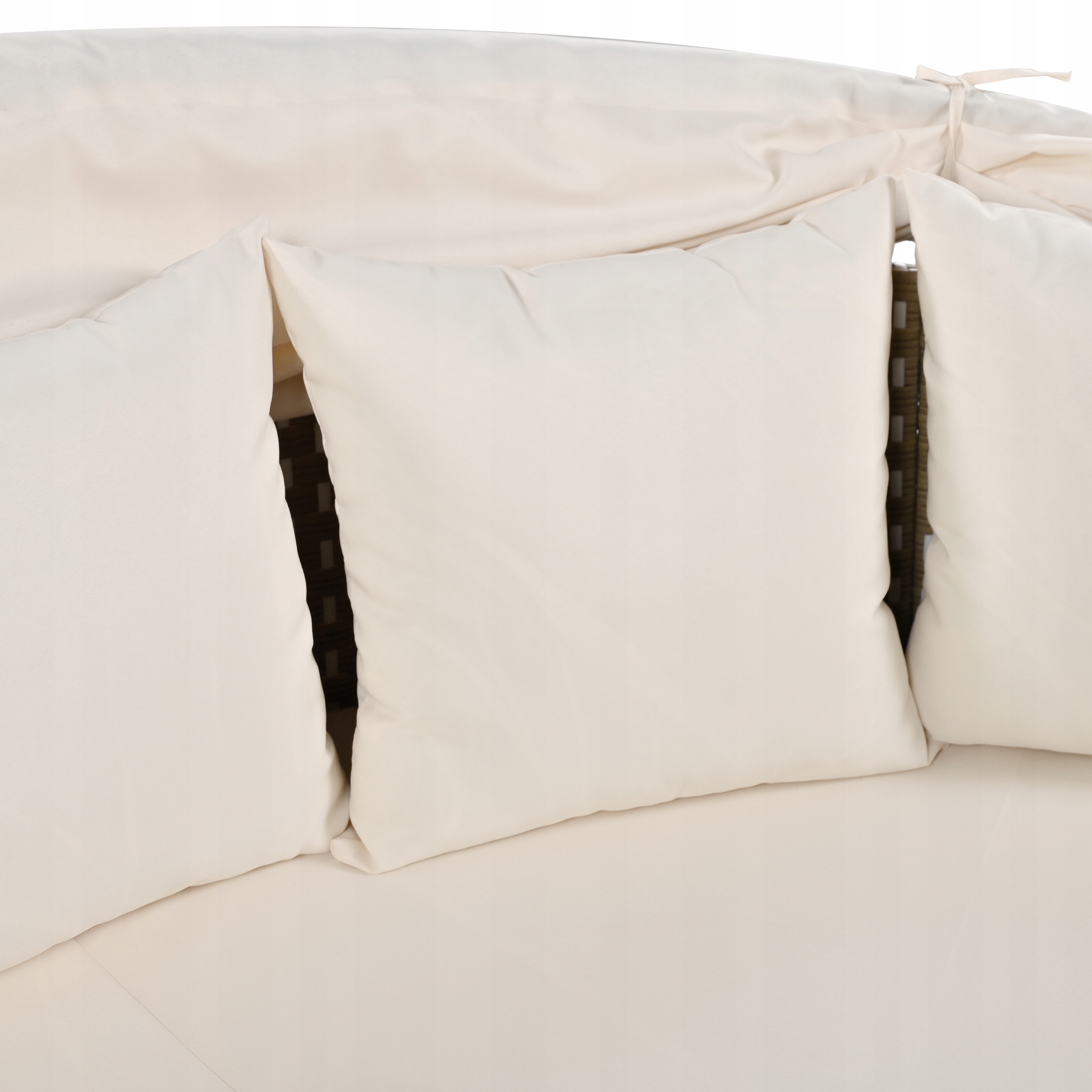 - Розміри продукту: Діаметр круглого сидіння 170 см, висота закритого тенту 72 см, висота твей відкрита 142 см. Одна людина важить 160 кг. Весь предмет меблів складається з 5 подушок, 1 подушки подвійного сидіння, 2 індивідуальних подушок сидіння та 1 круглої подушки сидіння