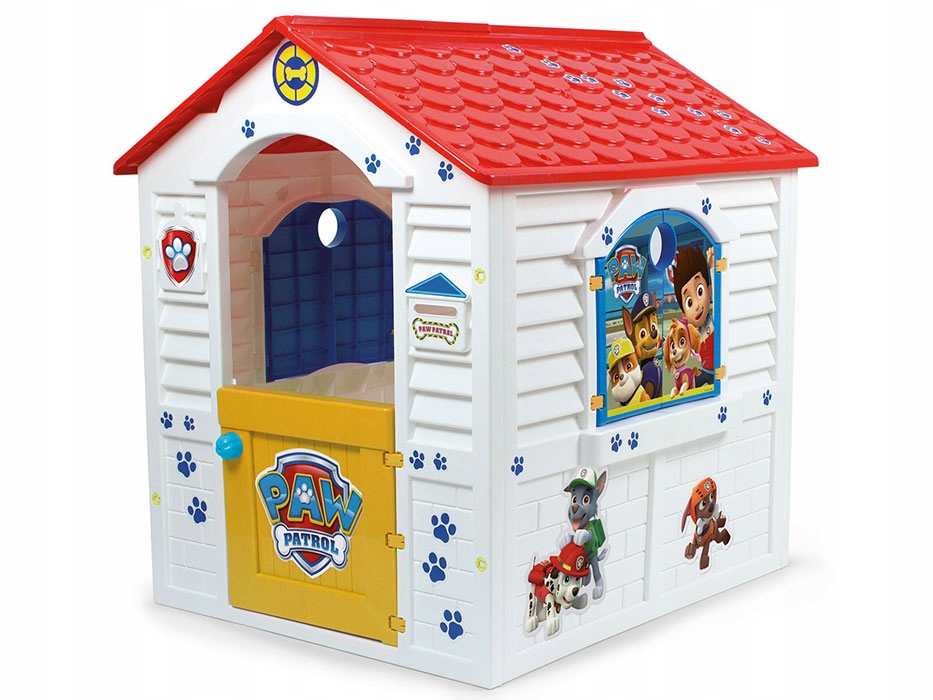 Щенячий патруль, будинок 89526. Білий будинок із характерними синіми відбитками собачих лап і веселими цуценятами. Дах червоний, з видними елементами черепиці та кількома відбитками лап. Будинок має жовту половину вхідних дверей, з логотипом Paw Patrol і синю круглу ручку. На стіні біля дверей ми помічаємо поштову скриньку та імітацію дзвоника. Відчинні блакитні віконниці з отвором у верхній частині, що додатково освітлює інтер'єр при закритих вікнах. Вікна ззовні вкриті барвистим принтом із зображенням собак і Райдера.