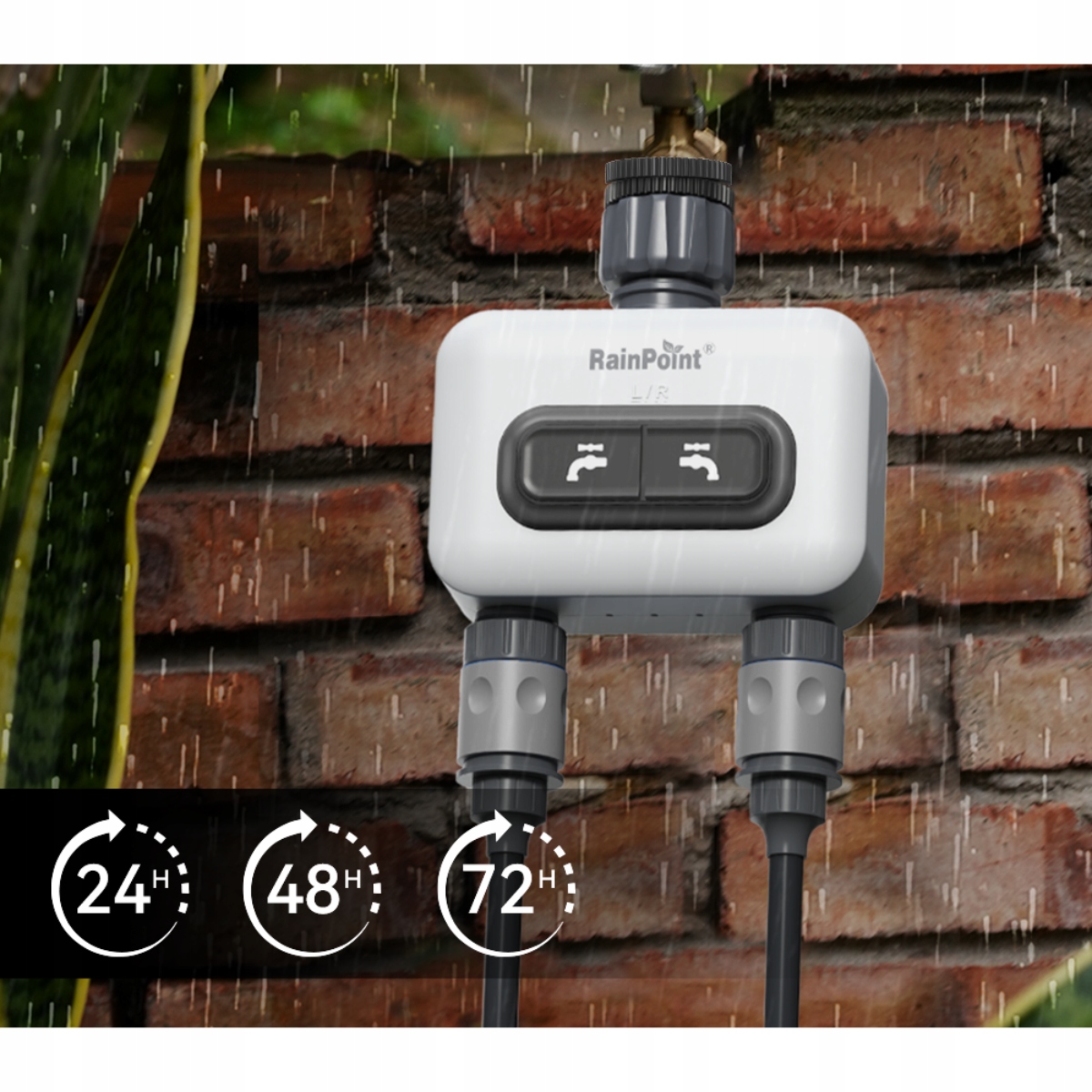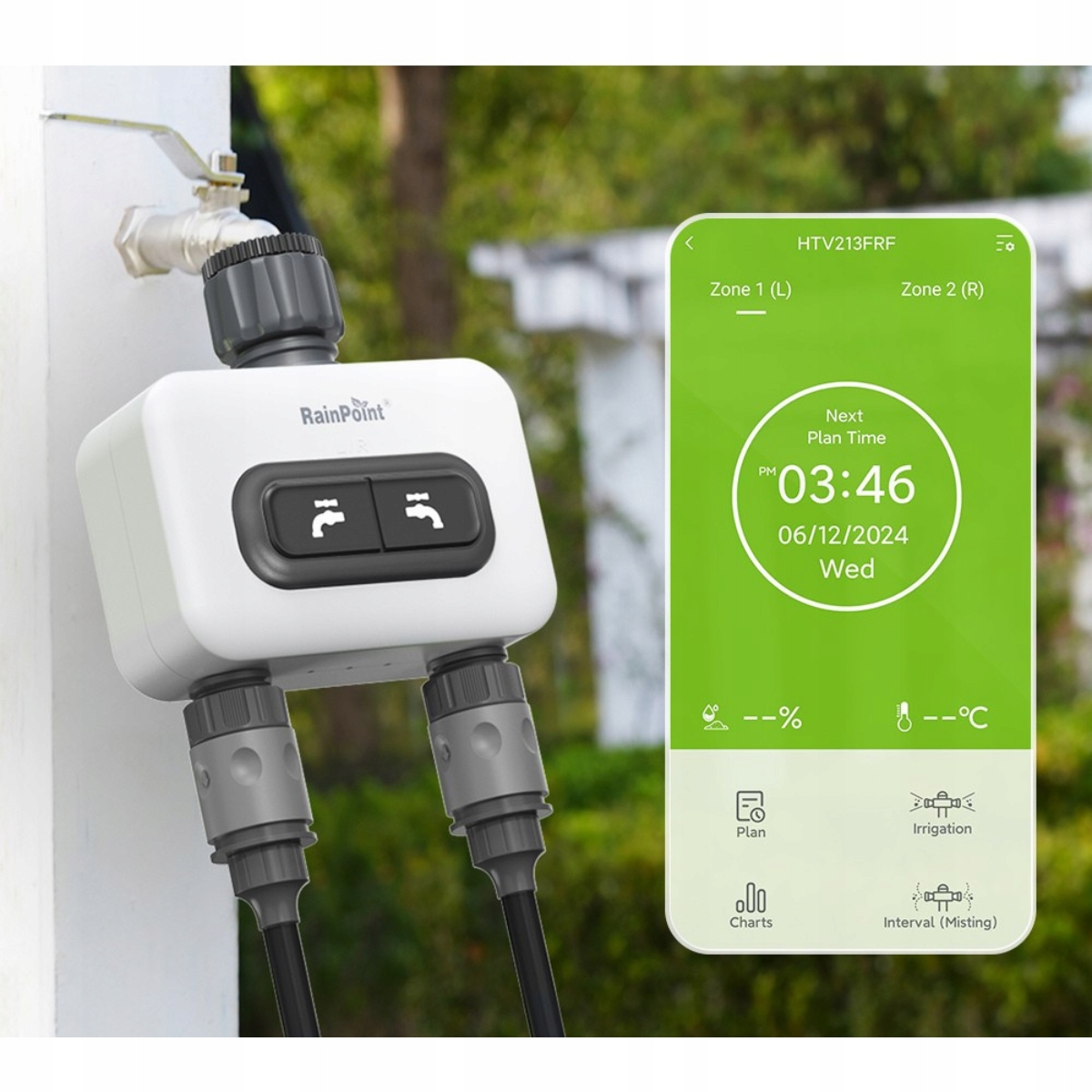 Rainpoint HTV213FRF + HWG023WBRF-це вдосконалена команда, програміст з двома зоною для садового шланга, який дозволяє автоматичне та дистанційне управління зрошенням мобільного застосування. Інтеграція з датчиками вологості ґрунту забезпечує оптимальний догляд за рослинами для економії води.