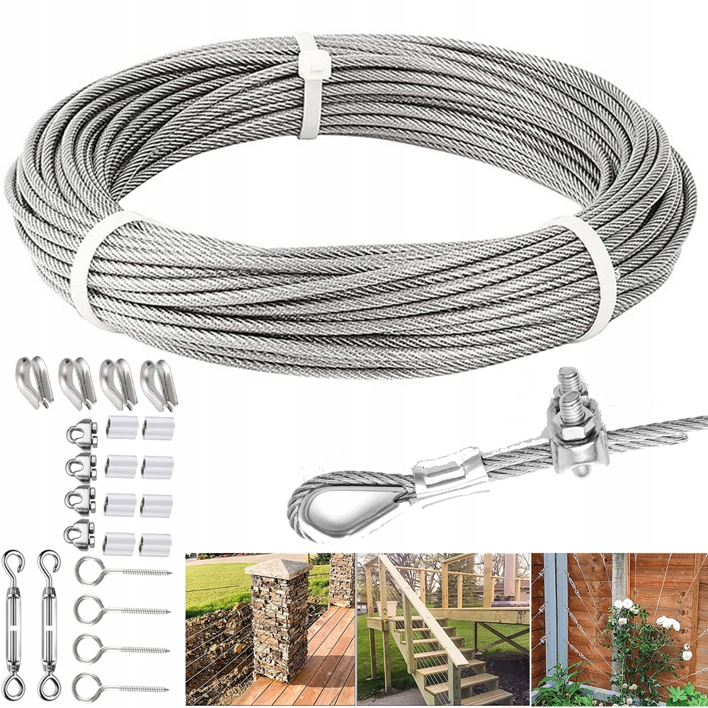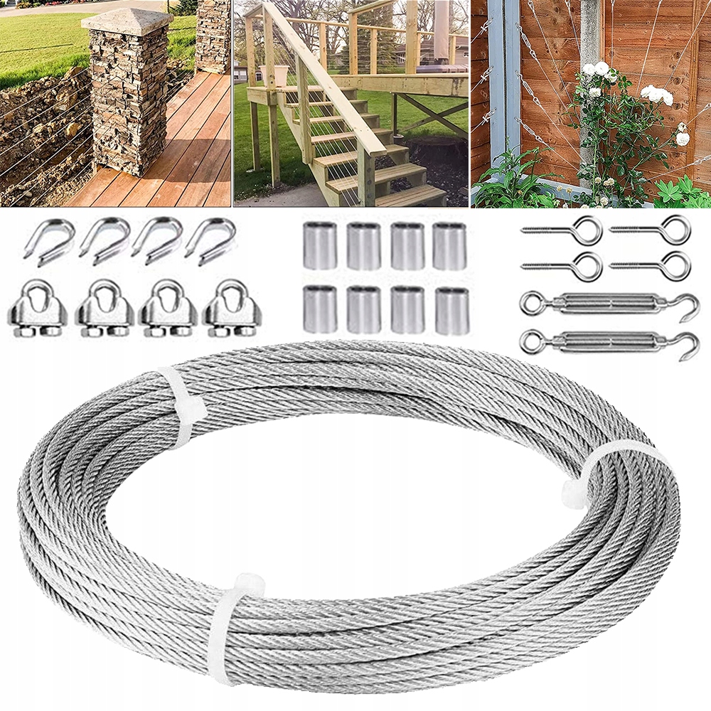 3 mm steel steel rope with a set of tensioners can be used to perform a wide range of heavy tasks and ensures greater flexibility of use, including suspending external lighting cords, chain sets, trigger wire sets, glycine wire sets on walls wire sets for plants, wire sets for pergola, рядки білизни