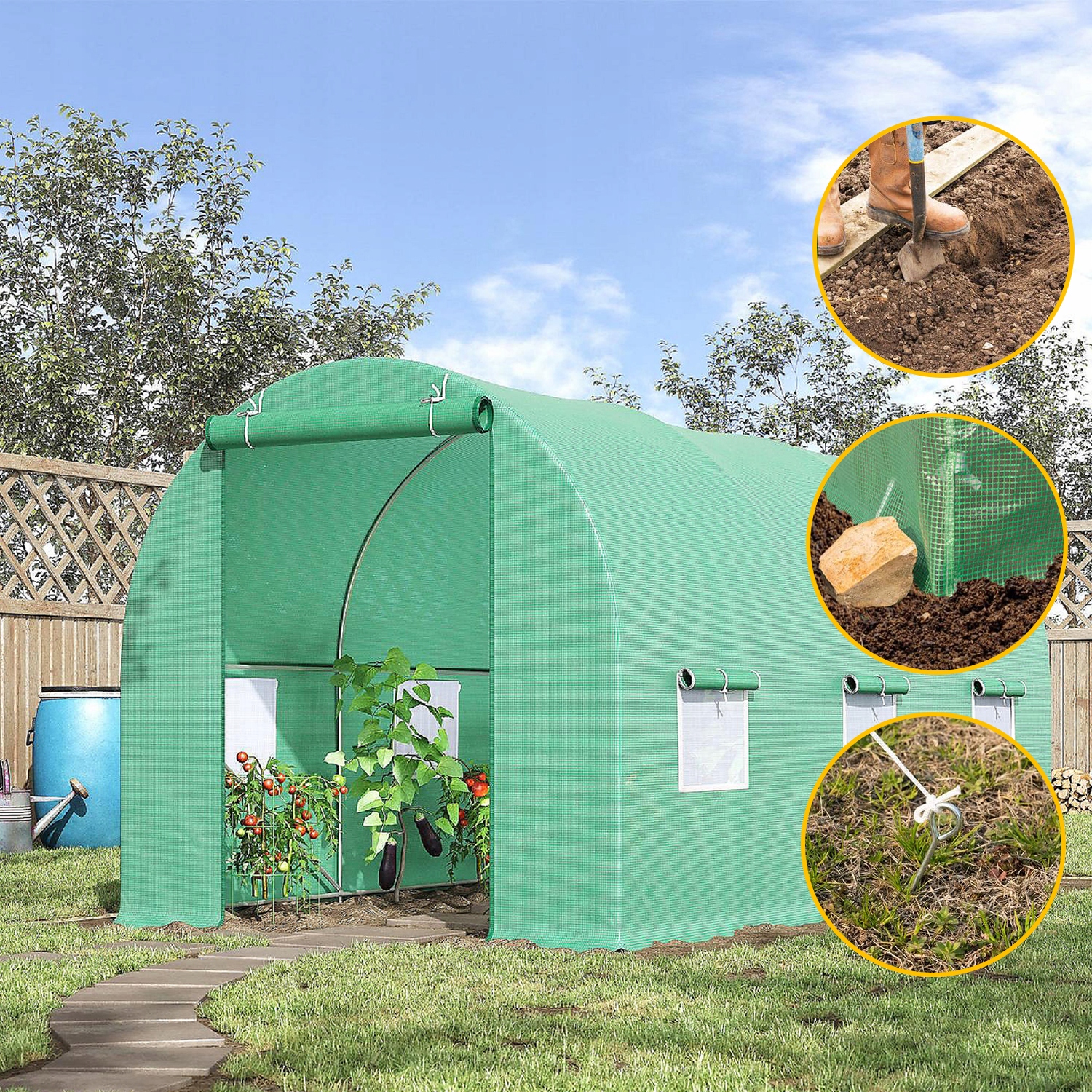 - Кріплення до землі : в самому кінці обов'язково додатково закріпіть вашу теплицю, прикріпивши її до землі, в набір входять металеві кілочки, анкери і міцна мотузка. З’єднайте конструкцію теплиці кілочками, туго натягнувши мотузку, завдяки чому тунель буде стійким навіть при несприятливих погодних умовах