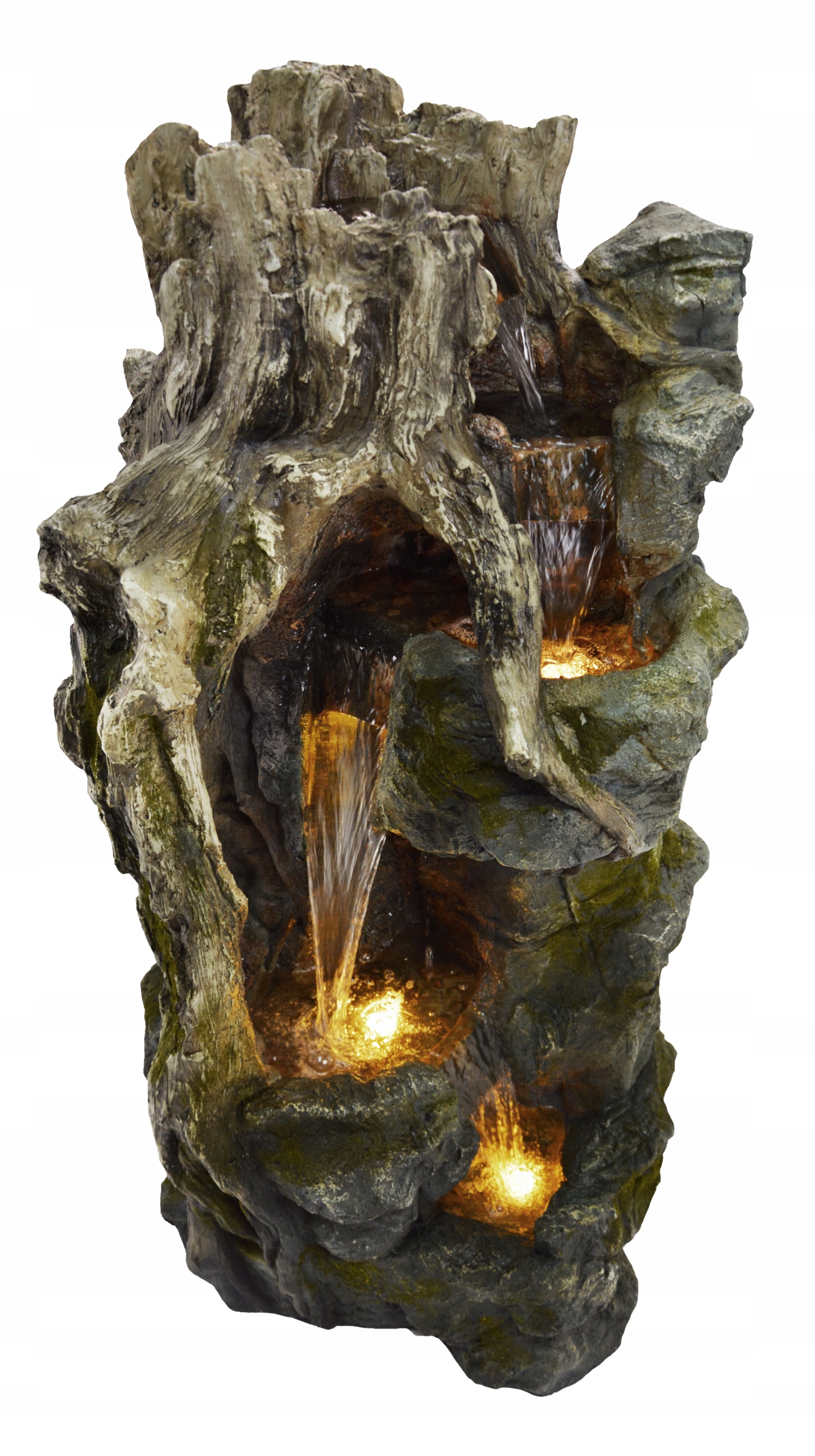 Нанесений на місці мох і точне фарбування підкреслюють його чарівність. Форма розроблена таким чином, що збоку також є звисаючий корінь зрізаного стовбура, що надає фонтану природного вигляду.