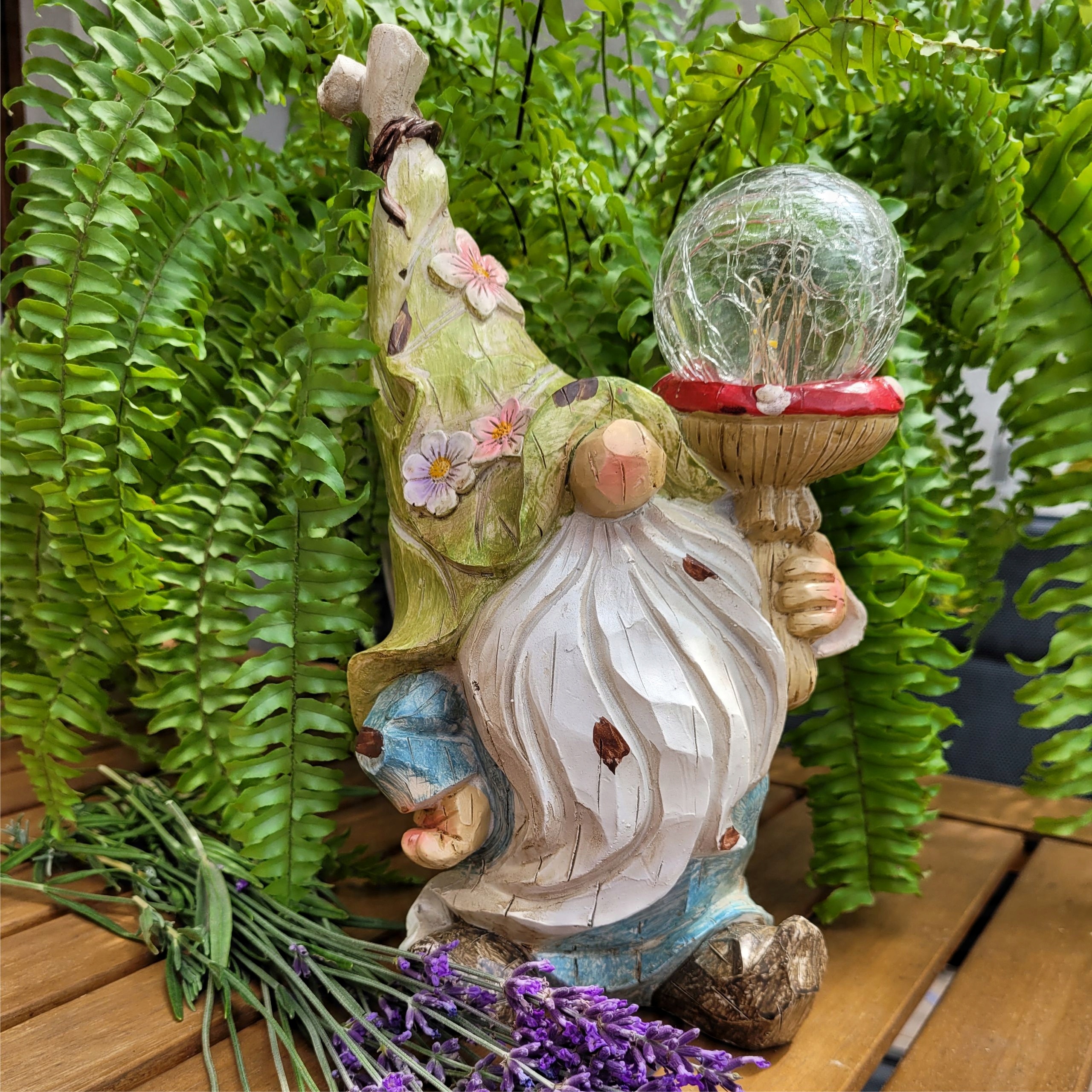 Ця чарівна фігурка гнома тримає в руці поганку з овальним куполом із підсвічуванням. Розписана вручну з чудовими деталями. Справжній витвір мистецтва є чарівним доповненням до будь-якого будинку чи саду.