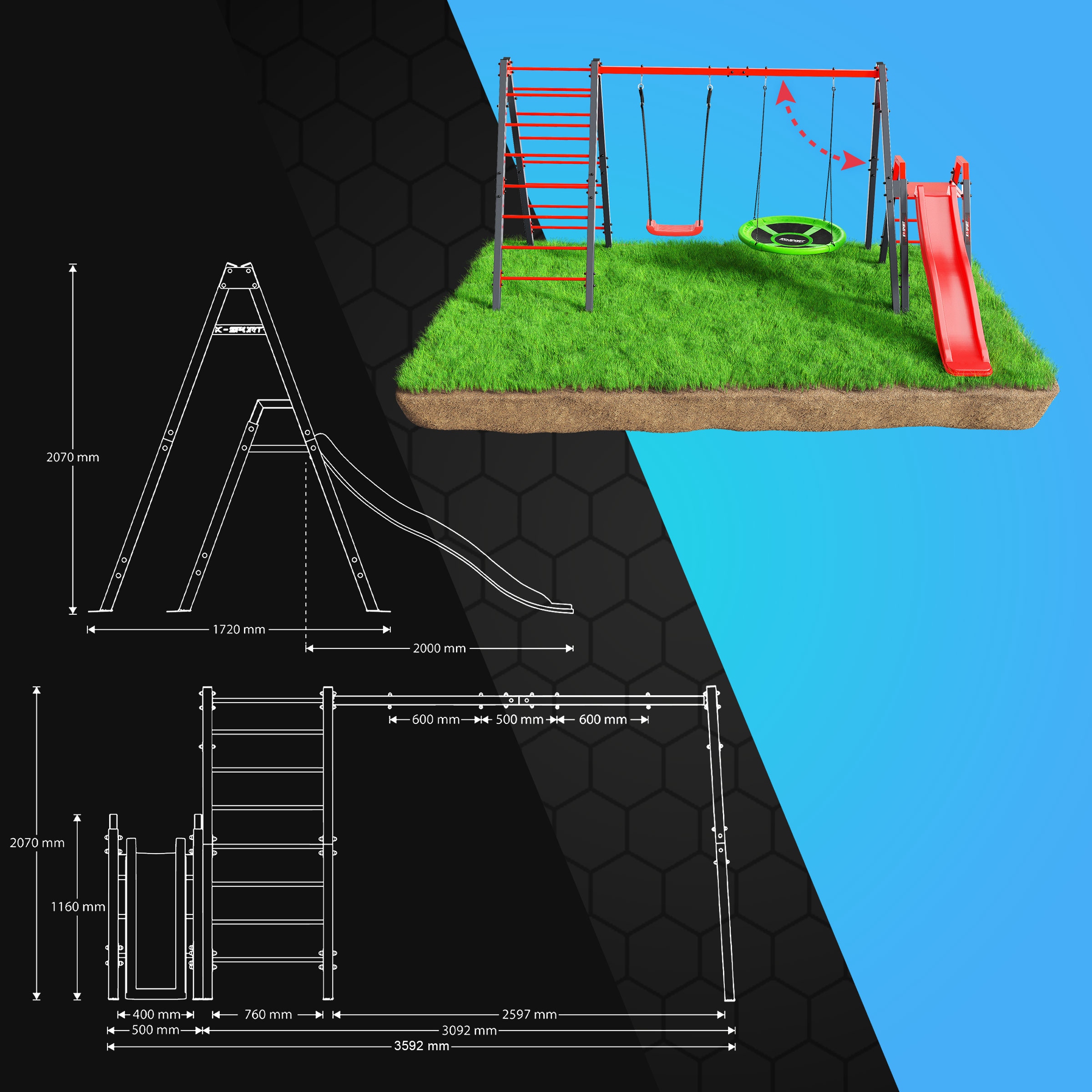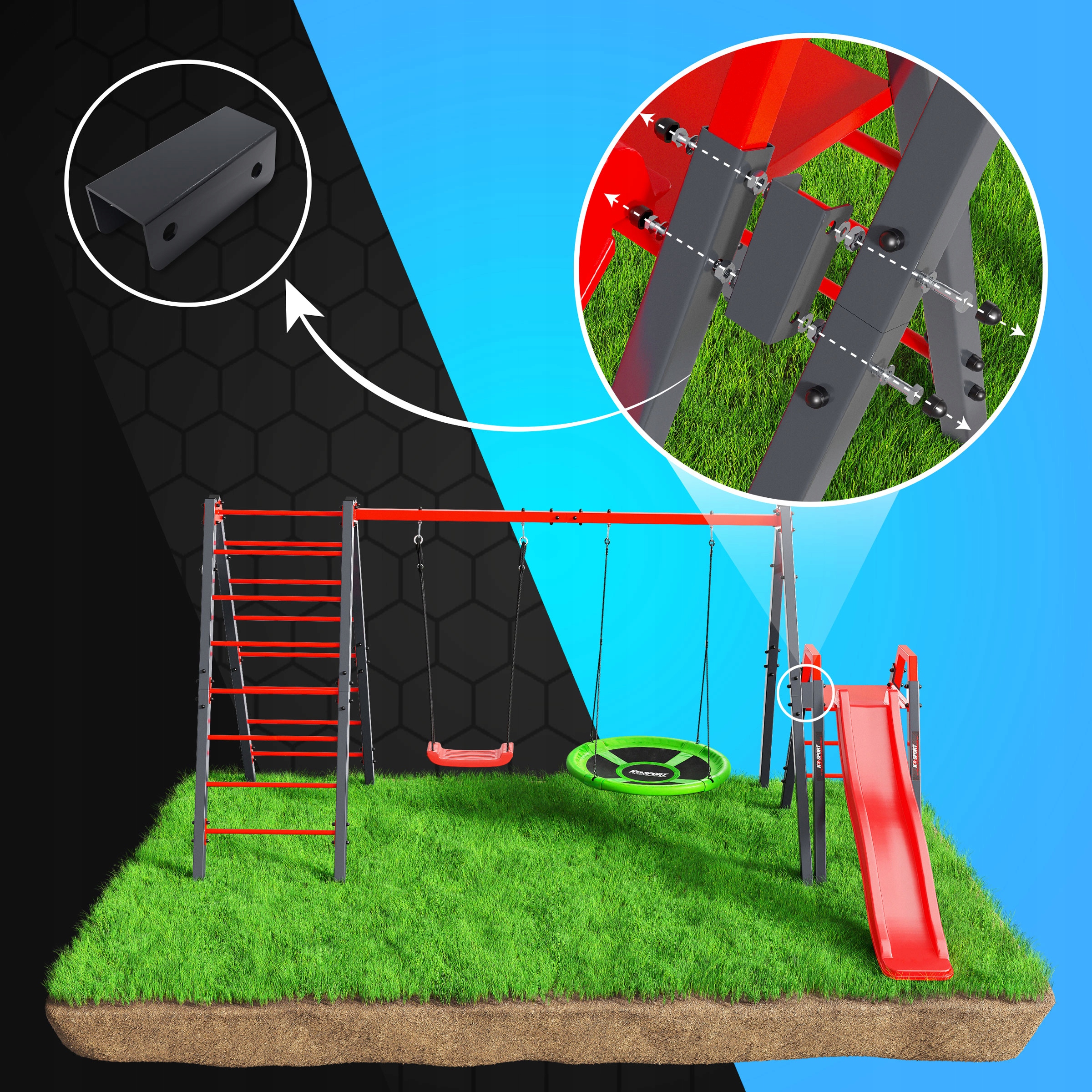 Усі гвинти були захищені пластиковими накладками . Завдяки цьому, використання кадру також є безпечним під час вільної розваги дітей. Будь то зліва чи з правою стороною гойдалки, буде прикріплений до слайда. Купуючи обладнання на цьому аукціоні Ви також отримуєте спеціальний металевий роз'єм , завдяки якому ви поєднаєте обидва кадри разом, створюючи стабільне ціле . Слайд також можна використовувати як безкоштовне обладнання , яке ви можете легко переходити до кожної частини свого саду. Гойдалка з слайдом завдяки його конструкції в більшості скручених гвинтів легко розібрати , завдяки якому ви можете легко запустити його, і приховати його, коли вам це більше не потрібно.