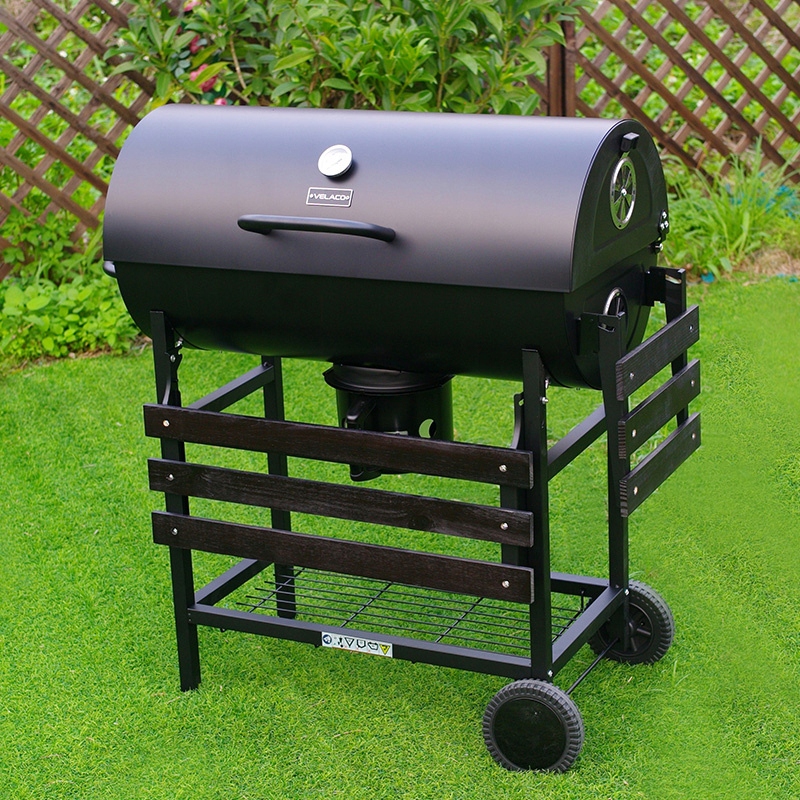 ☑️ Якість і доступна ціна - Вугільний гриль VELACOпофарбований у чорний колір, що забезпечує це привабливий зовнішній вигляд. Піддон для вугілля оцинкований, що означає, що він стійкий до корозії та довго зберігає свій первинний вигляд. У наборі цілих 2 решітки, одна велика, 70х35 см - хромована, а інша менша, ідеальна для запікання овочів. Гриль має чорні дерев'яні полиці, які служать практичним місцем для розміщення кухонних інструментів або мисок з підготовленими інгредієнтами.