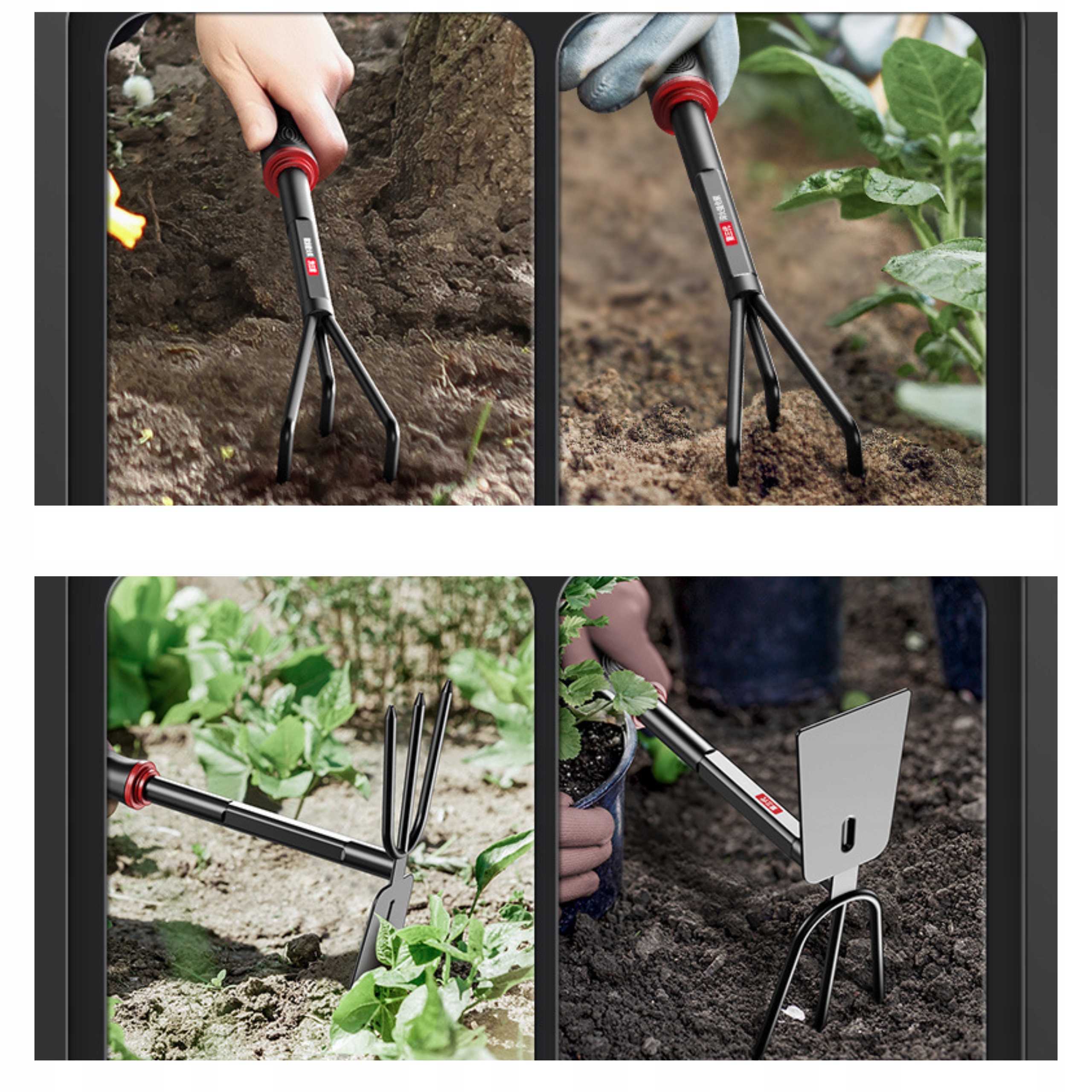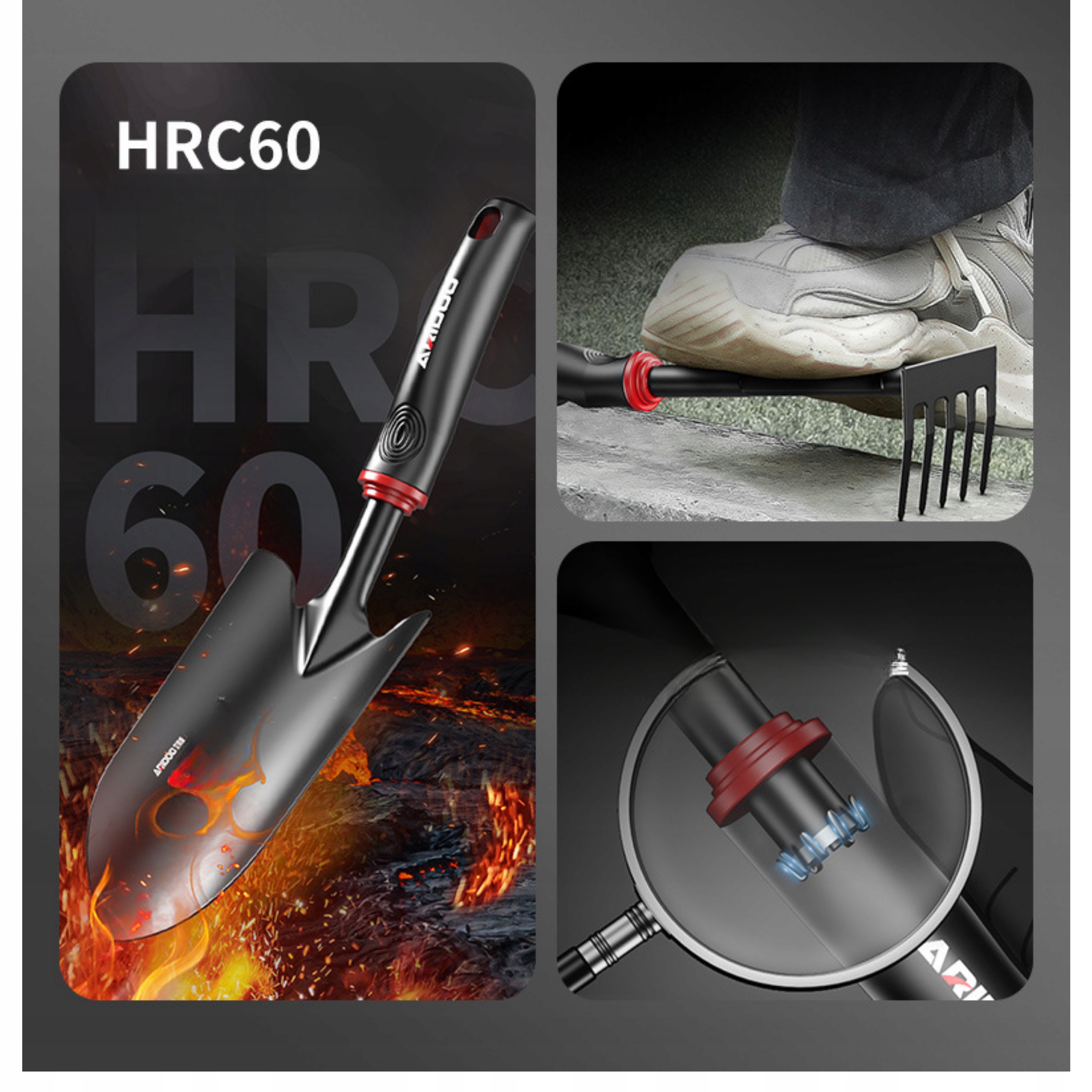 Набір інструментів із загартованої сталі HRC60 є гарантією виключної довговічності та надійності навіть під час інтенсивної роботи. Висока твердість сталі означає, що інструменти не гнуться, не тріскаються і довго зберігають свою форму навіть у твердому, компактному ґрунті. Завдяки цьому кожне врізання в землю відбувається впевнено і точно, без втрати контролю. Порошкове покриття для захисту від вологи, корозії, солі та механічних пошкоджень. Це рішення для людей, які хочуть купити один раз і зробити все правильно - зносостійкі інструменти, готові до роботи сезон за сезоном