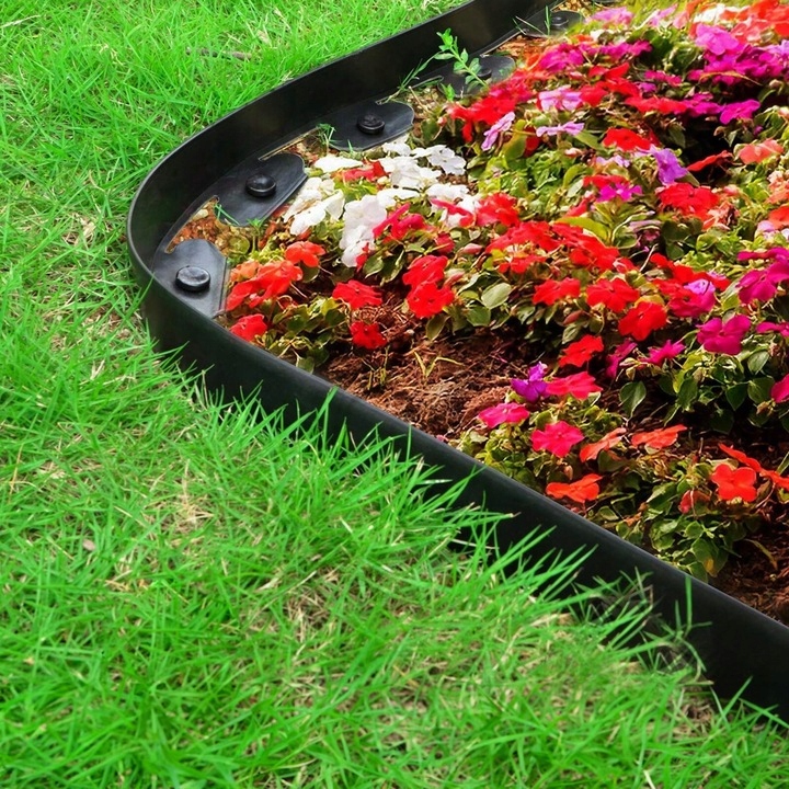 Газонний край використовується для розробки садів для відокремлення газону від доріжок, інших частин саду, знижки на квітку, кори або крупи. вони встановлюються за допомогою якорів, які дозволяють регулювати форму.