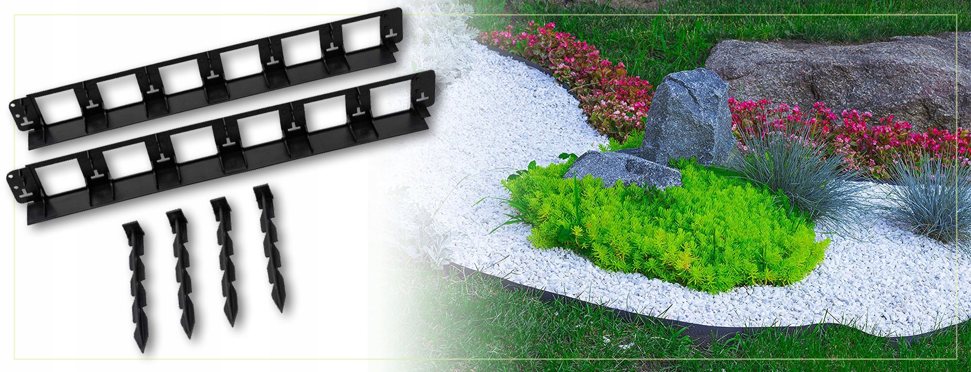 - Легка та швидка збірка - набір включає 24 сильні якорі для стабільного кріплення. Обріз можна встановити без використання спеціалізованих інструментів - все, що вам потрібно, - це молоток, щоб загнати якір у землю. При необхідності сегменти можуть обрізати обрізання ножиць, адаптуючи їх до індивідуальних потреб.