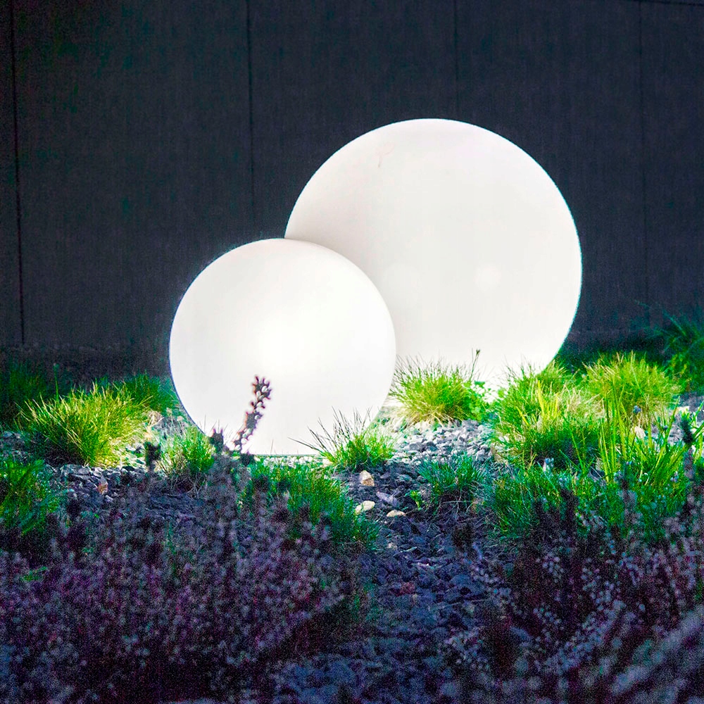 Садові світильники білі кулі з абажуром з італійського поліметакрилу, що забезпечує рівномірне розсіювання світла та стійке до погодних умов та механічні пошкодження. Їх можна успішно використовувати в місцях, які піддаються впливу води. Лампу можна легко замінити, що полегшує використання знімної основи. Виготовлено в ЄС.
