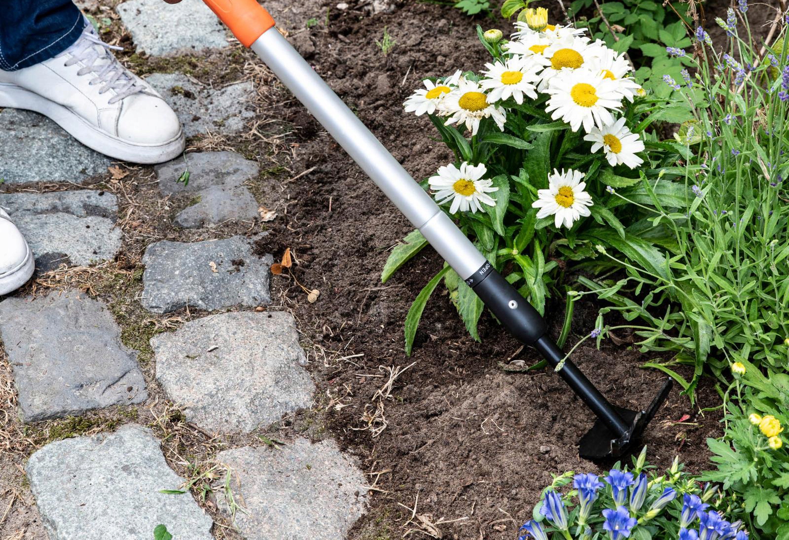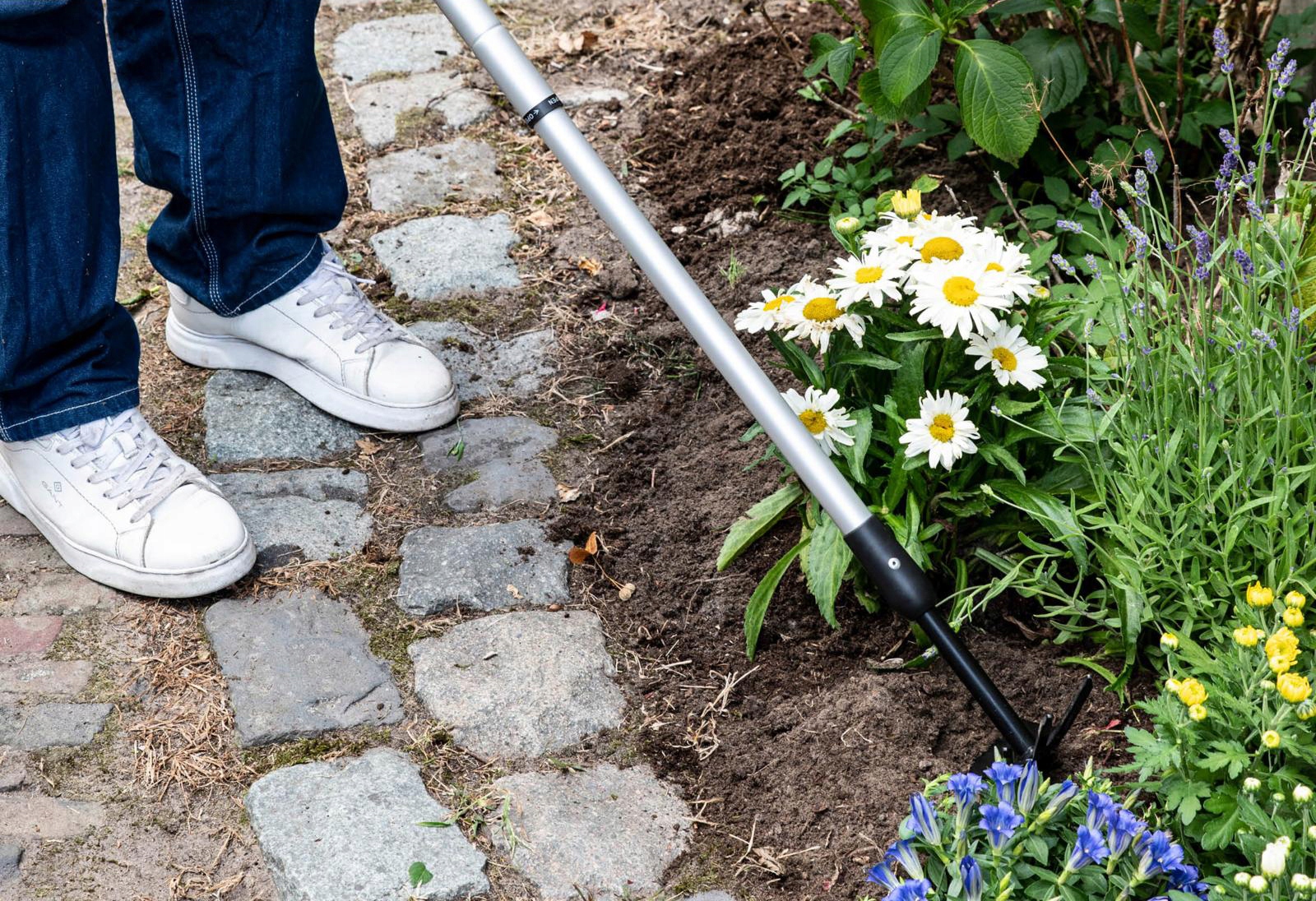 - Двостороння конструкція з мотикою та трьома зубцями для обробки ґрунту дозволяє виконувати широкий спектр садових робіт без необхідності заміни інструментів >