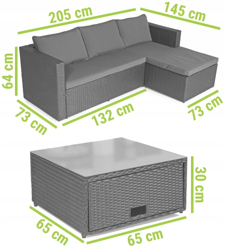 - У набір входить: садовий стіл, кутовий диван (або 2-місний диван х 2 шт.), довга подушка для сидіння х 2 шт., подушка для спинки х 3 шт. li>