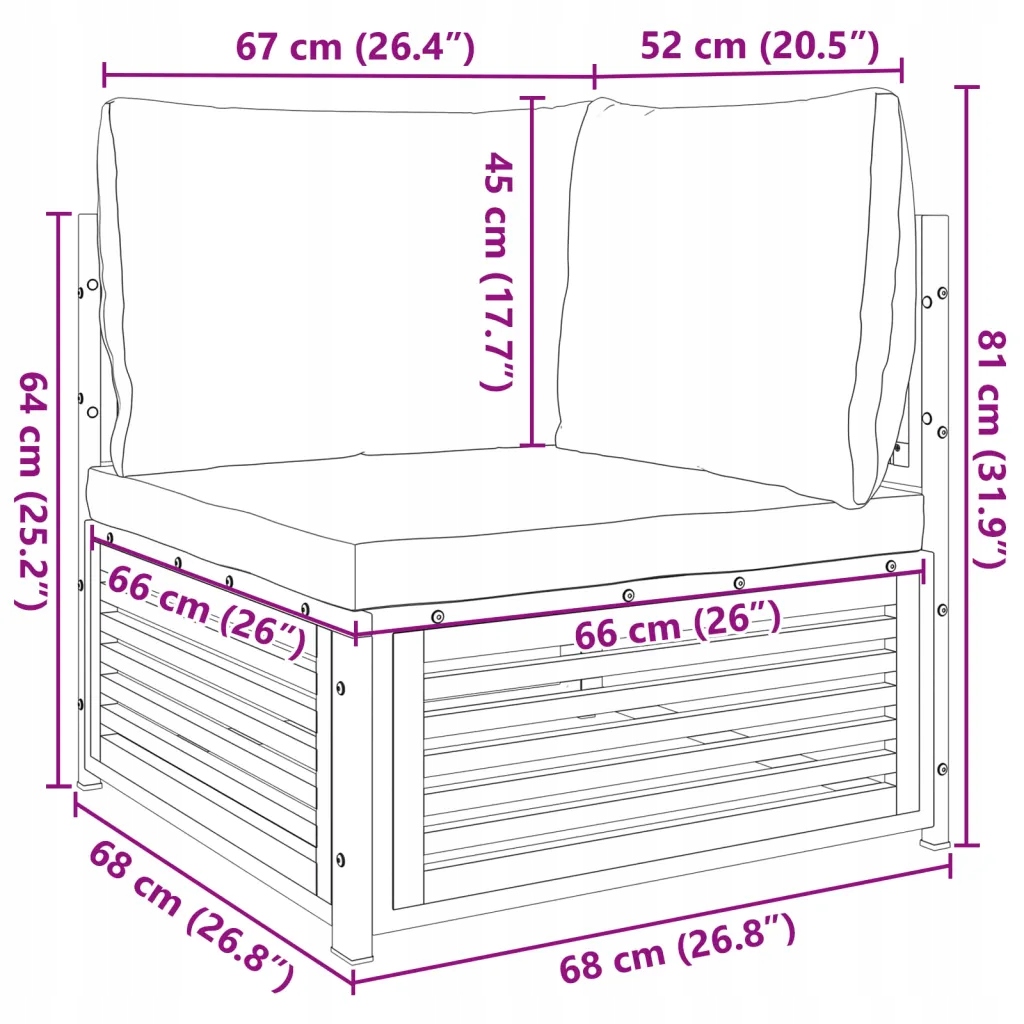 - Розміри подушки для сидіння: 66 х 66 х 6 см (ширина X, головна x gr. см (довжина x ширина x gr. corner