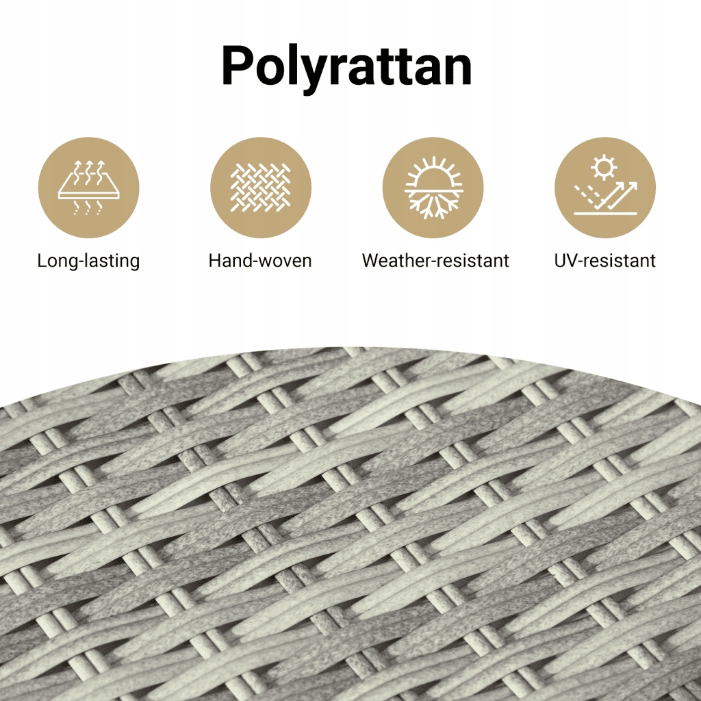 - Стійкий матеріал: поліетиленовий ротанг, також відомий як поліротанг, є міцним і простим у догляді пластиковим матеріалом, схожим на натуральний ротанг. Він легкий, легко миється та широко використовується у виробництві виробів, призначених для зовнішнього використання, завдяки своїй довговічності та стійкості до погодних умов.