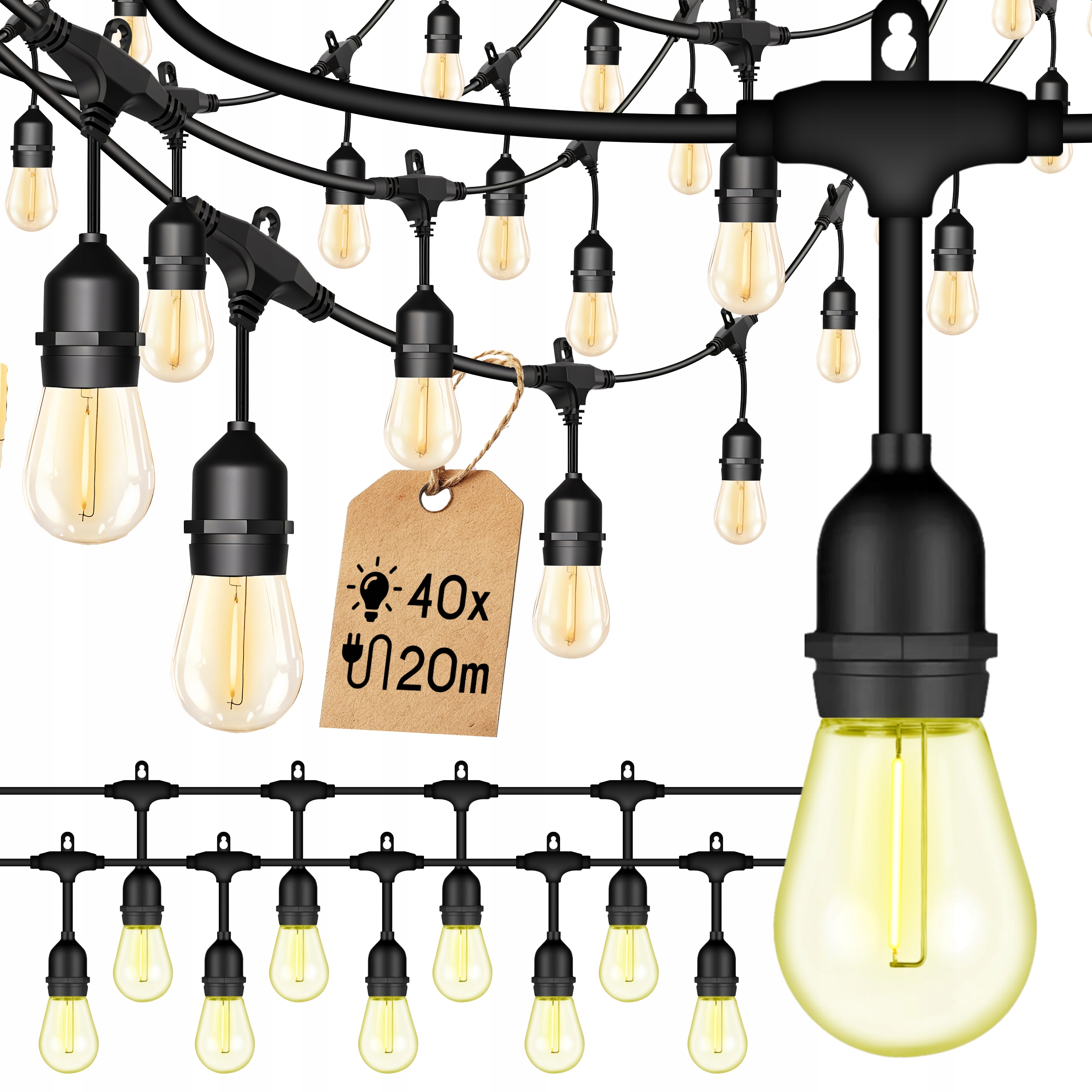 - Girlland оснащений 40 кадрів для лампочок E27 - Це найпоширеніша нитка, що використовується при домашньому освітленні. Завдяки цьому ви можете легко замінити лампочки на будь -які інші відповідні ваші уподобання.
