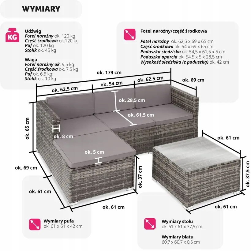 Вага кутового крісла (з подушками): прибл. 9,6 кг