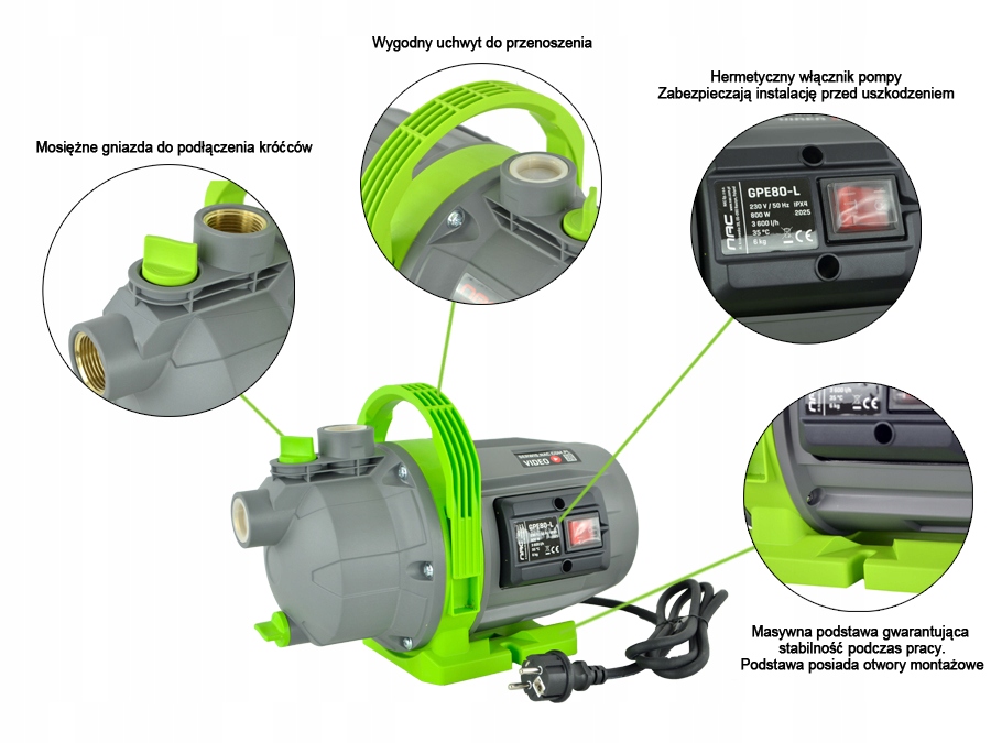 Насос використовується в домашньому господарстві та як необхідний пристрій для садівників. Він має дуже ефективний двигун 800 Вт, який дозволяє отримати продуктивність 3600 літрів/год. і робочий тиск до 2,8 бар. Максимальна висота пресування - 40 метрів, а максимальна глибина всмоктування - 7 метрів.