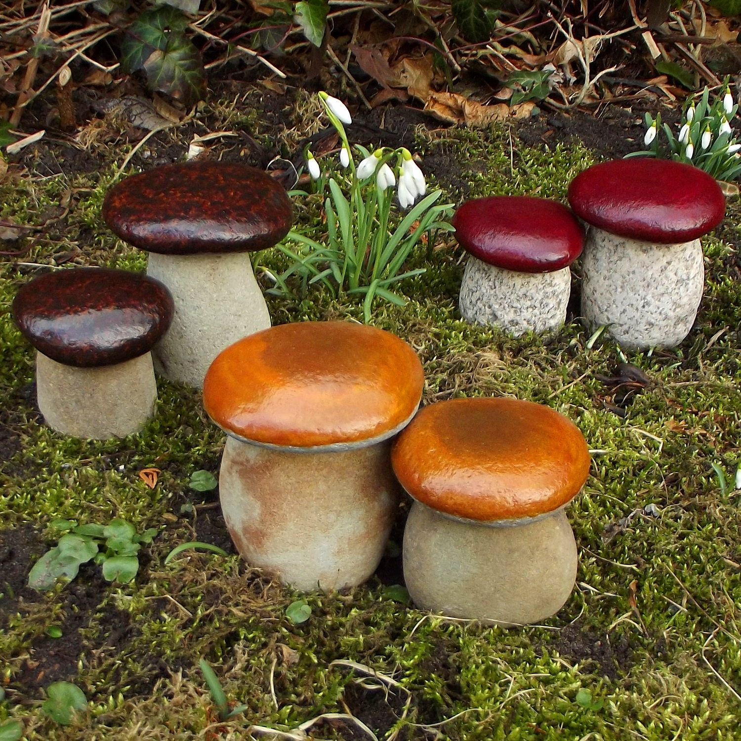 Набір із 6 садових грибів із натурального каменю, великих і маленьких кожного кольору. Фігурки стійкі до погодних умов. Ідеальна прикраса для альпінарію, клумби або під хвойні рослини. Кожен набір трохи відрізняється, тому що він виготовлений з натуральної гальки.