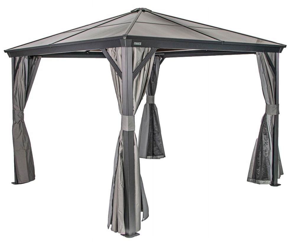 Цей красивий садовий павільйон розміром 3х3 м стане прикрасою будь-якого саду, будь-якої тераси або патіо. Покрівля виконана з стільникового полікарбонату товщиною 6 мм, що ідеально підходить для захисту від УФ-випромінювання та дощу. Після сезону сніг також не буде проблемою, адже снігове навантаження даної конструкції становить до 110 кг/м2покрівлі. Рама виготовлена з алюмінію з порошковим покриттям антрацитового кольору, що гарантує відсутність корозії. У комплект також входять москітні сітки (входять в комплект), які встановлюються на незалежні напрямні, що дозволяє закріпити і налаштувати захист від вітру або настирливих комах (штори в комплект не входять). У конструкції даху встановлено два гаки, на які можна повісити освітлення чи інші прикраси для вашого саду.