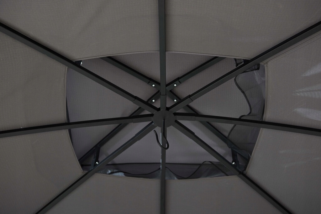 Вентильований 2-шаровий дах від тканини забезпечує захист від шкідливого ультрафіолетового випромінювання, одночасно забезпечуючи вільний потік вітру, заохочуючи циркуляцію повітря та створення комфортного та відкритого приміщення для вашого задоволення.