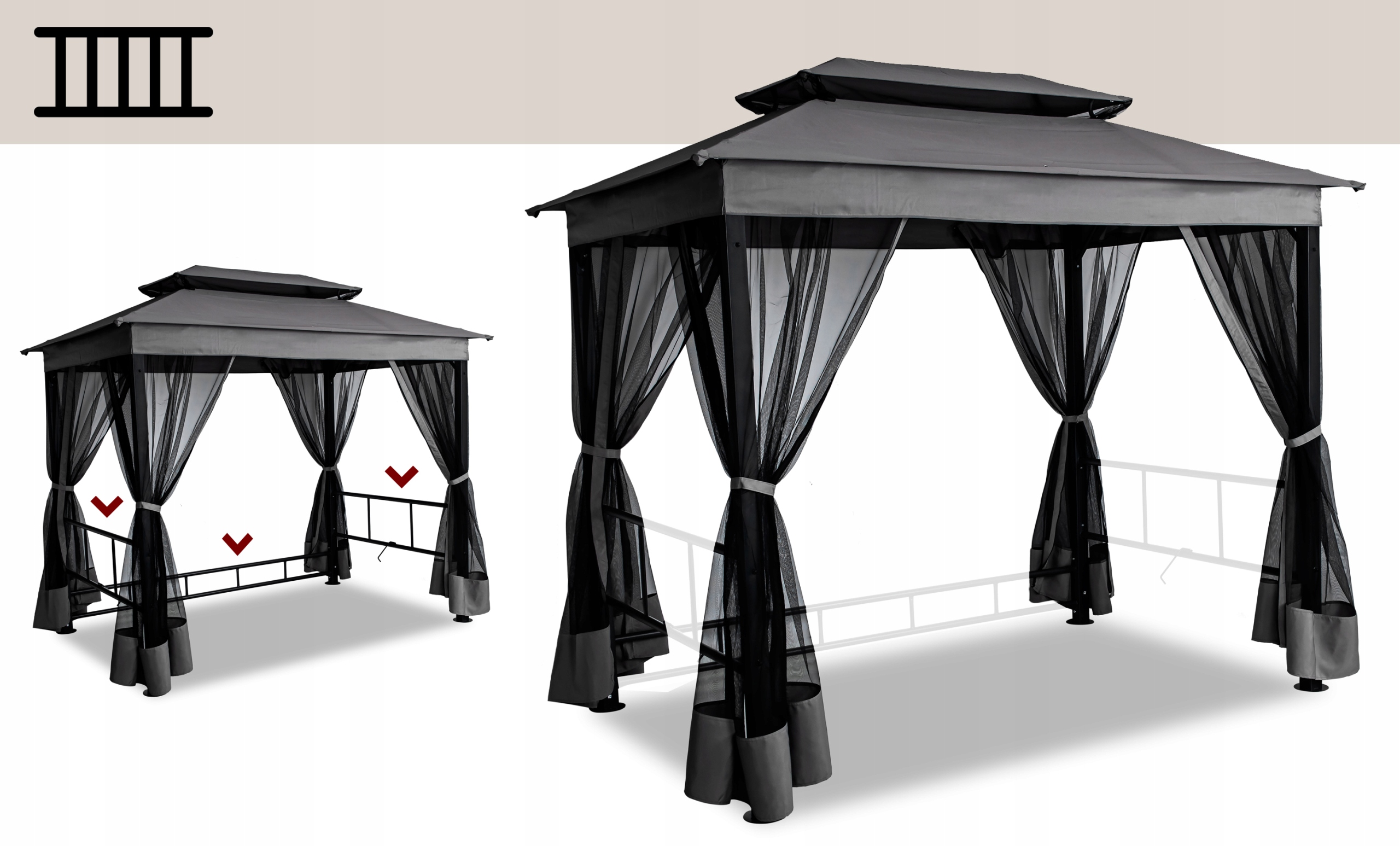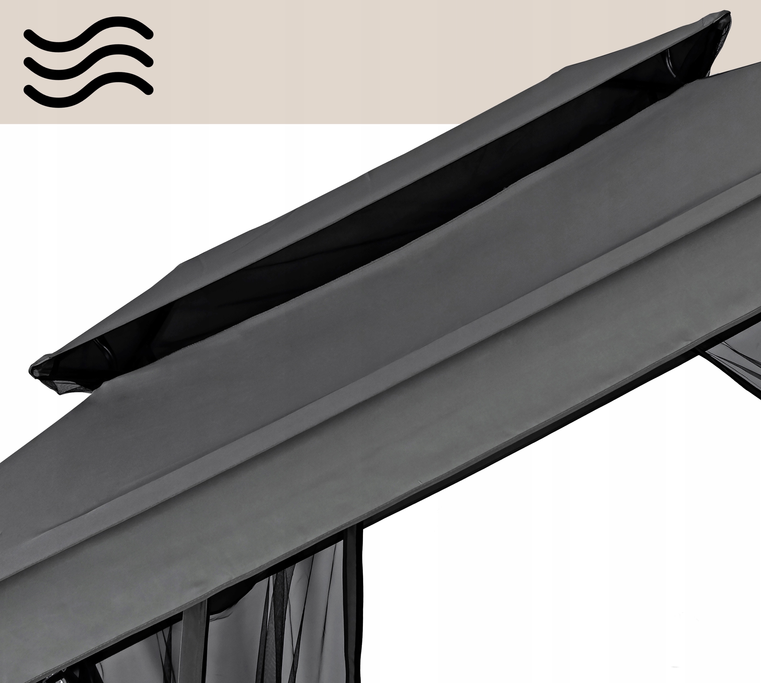 - Альтанка Oman оснащена надзвичайно практичною москітною сіткою. Захист покриває всі стіни та може бути встановлений дуже швидко - просто відкріпіть зі стійок і посуньте її на закриту блискавку.
