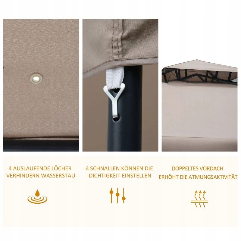 Завдяки елегантному та продуманому дизайну ця елегантна альтанка від Outsunny перетворить ваш відкритий простір на практичне та стильне місце для зустрічей. Водонепроникний дах захищає від УФ-випромінювання та сильного сонячного світла, залишаючись світлостійким. Сталева рама з порошковим покриттям і дах з поліестеру прослужать вам багато років. Почніть планувати свою наступну вечірку в саду у вашому новому павільйоні вже зараз і насолоджуйтеся теплою порою на повну! Опис: ✔ Дизайн подвійного даху ✔ Міцна поліефірна тканина з покриттям PA для захисту від ультрафіолетового випромінювання та сильного сонячного світла ✔ Практичний подвійний дах із москітною сіткою для кращої циркуляції повітря та захисту від комах ✔ Міцний металевий каркас з порошковим покриттям ✔ Регульований дренаж води через 4 люверси ✔ 8 кілочків для кріплення до землі та 4 відтяжки забезпечують додаткову стійкість. Примітка: не залишайте павільйон відкритим під час сильного вітру чи поганої погоди, інакше він може бути пошкоджений.