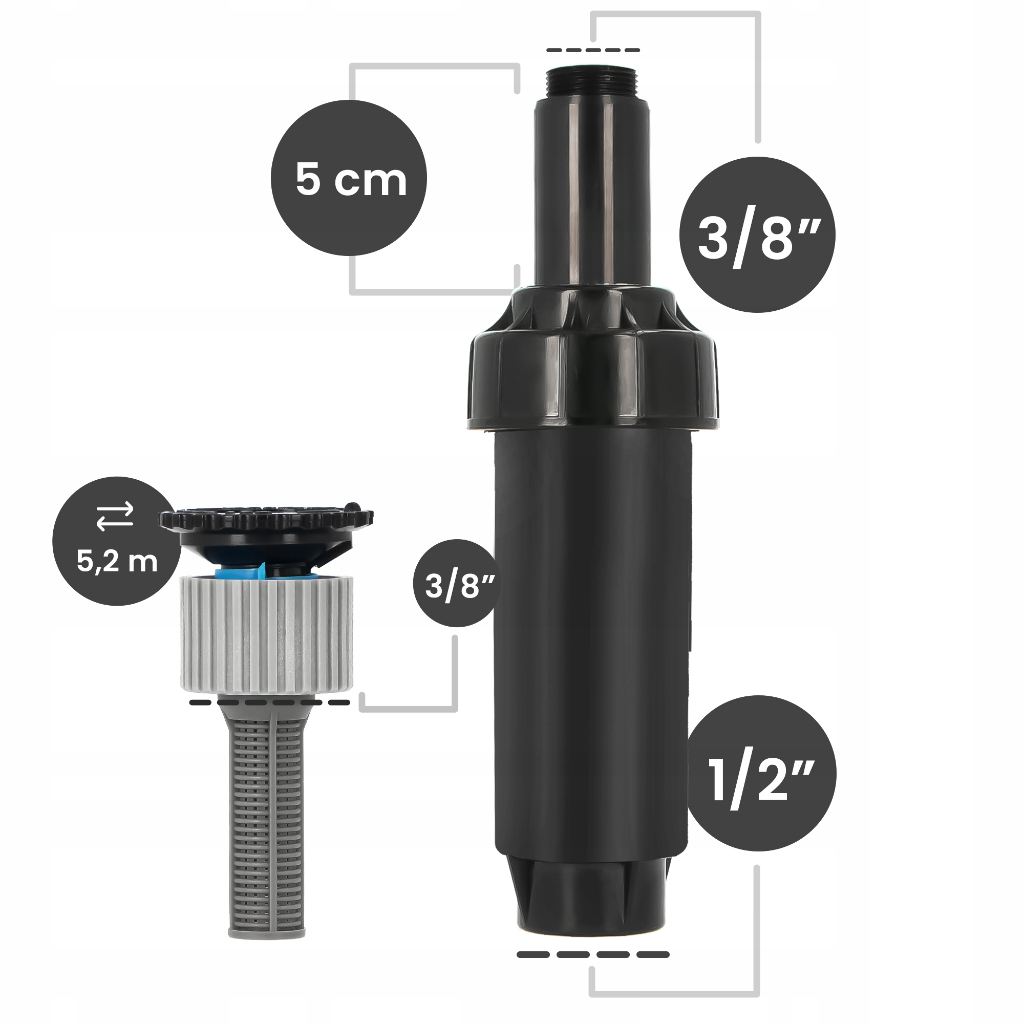 Витягнутий спринклер 5 см 1/2 '' gw x 3/8 '' gz з регульованою насадкою 0-360 °/5,2 м 3/8 '' gw