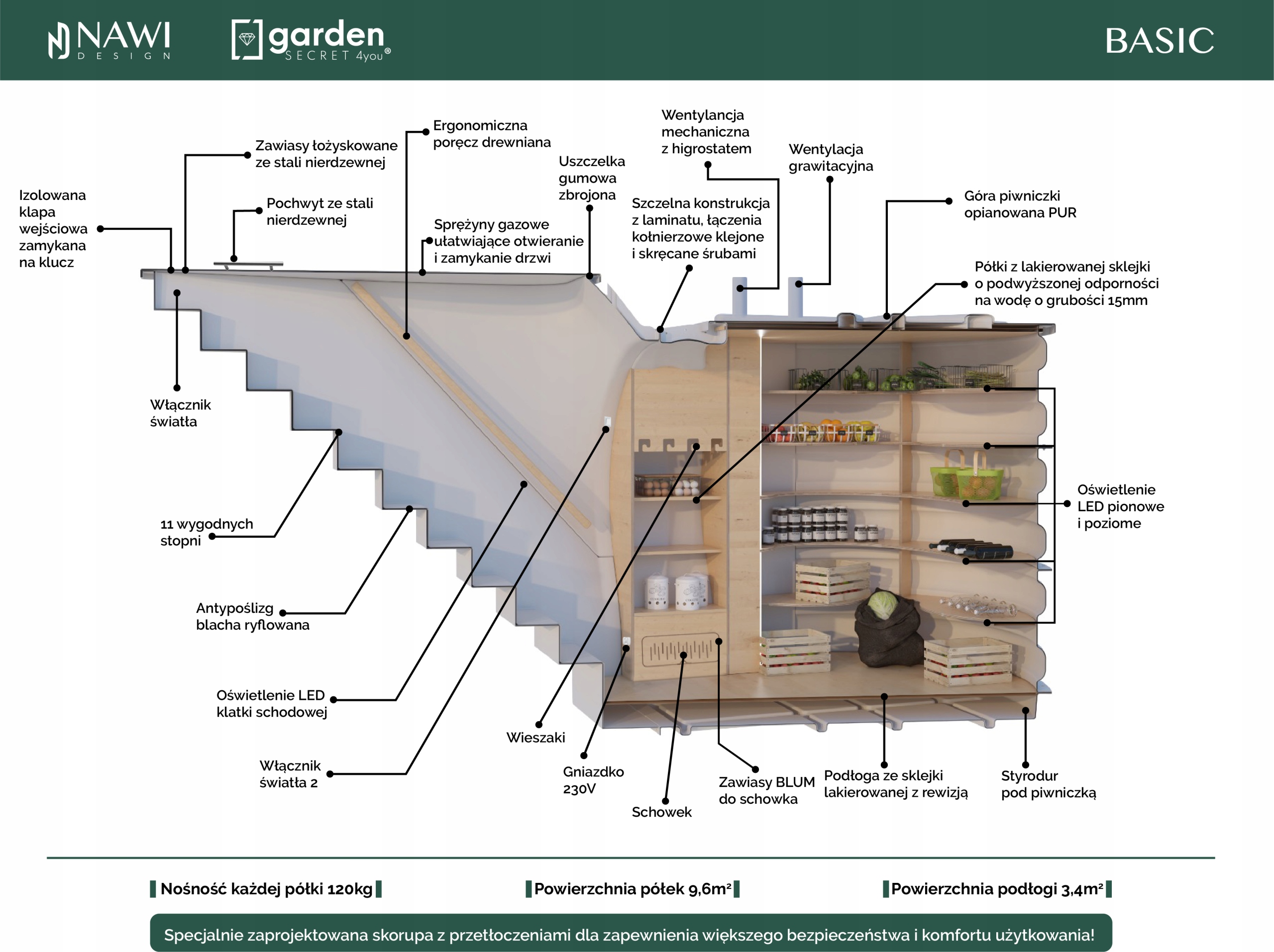 Уявіть, що ви можете зберігати фрукти, овочі, консерви та навіть колекцію вин в ідеальних умовах, щоб зберегти їх свіжість і смак - без необхідність використання електроенергії, холодильників або хімічних консервантів. Завдяки природним властивостям землі, Garden Secret 4 you® Basic використовує прохолоду, вологість і теплоізоляцію для створення оптимальних умов для тривалого зберігання. Ваші запаси залишаться свіжими, повними харчової цінності, і ви будете впевнені, що використовуєте екологічні та здорові рішення.