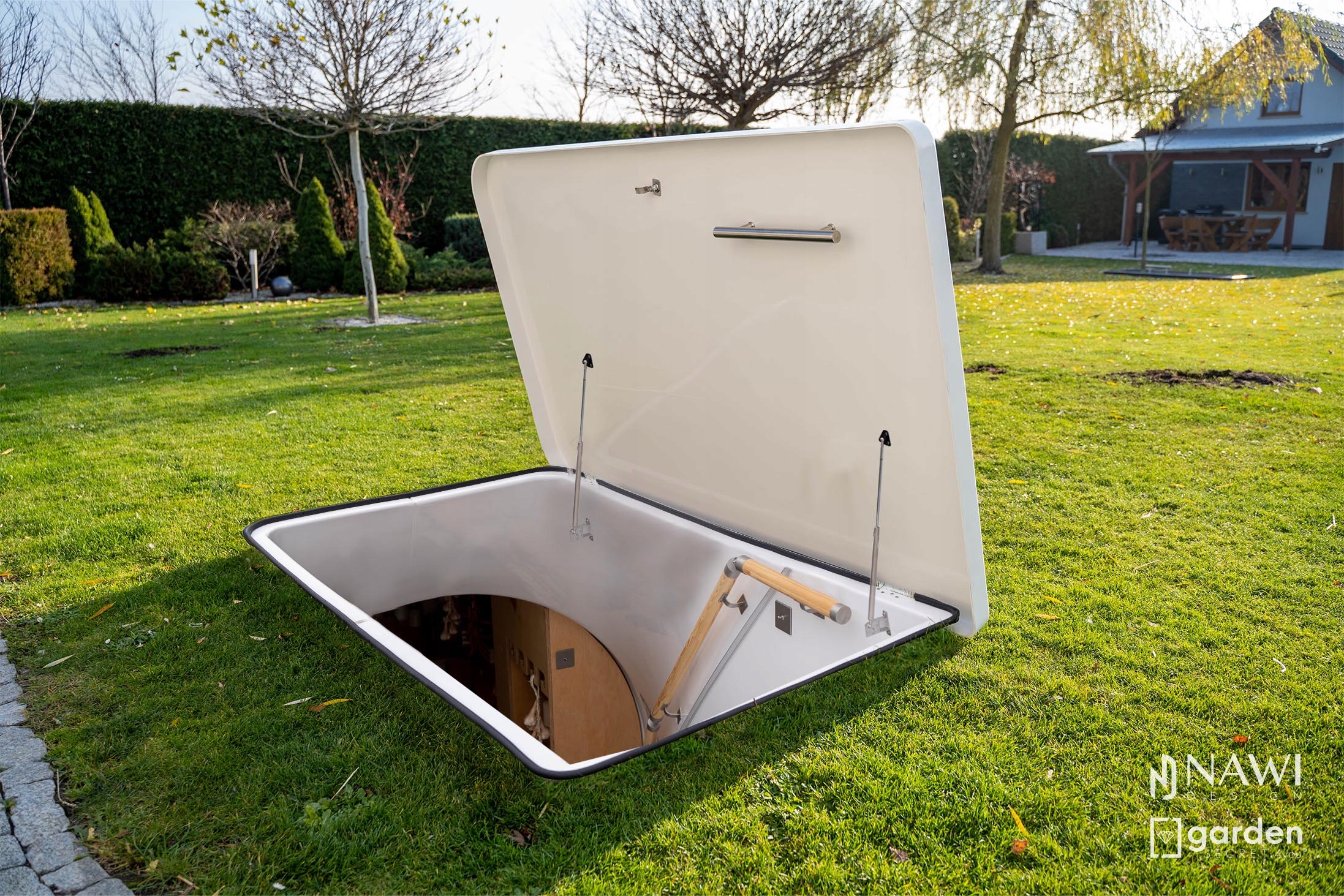 Завдяки повному викопуванню підвалу під землею Garden Secret 4 you® Basic не порушує архітектуру саду, і вам не потрібно турбуватися про великі, непривабливі конструкції. Підвал залишається практично непомітним, забезпечуючи вам полицю площею до 9,6 м² і площею підлоги 3,4 м². Це ідеальне рішення для зберігання запасів для всієї родини або навіть більшої кількості врожаю з саду чи городу.