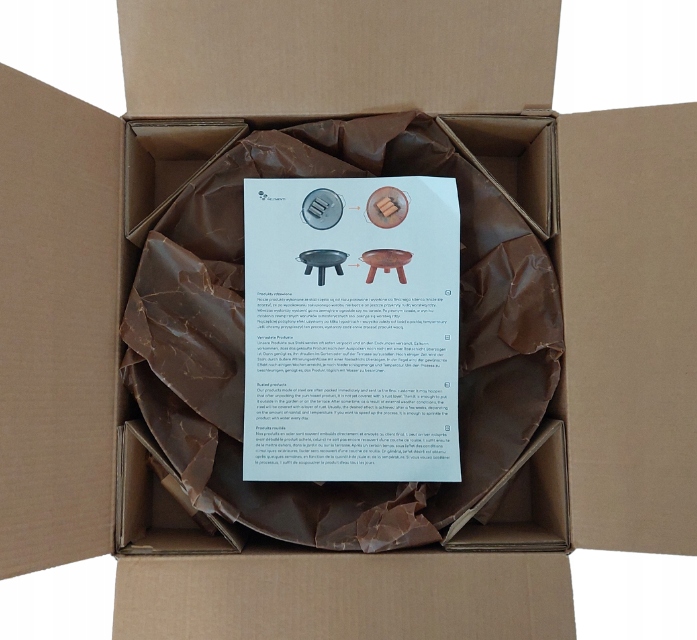 Зроблено з сирої сталі, нефарбований. Готовий до спалювання! Перед першим користуванням ви позбудетесь від виробничих залишків (невеликий, невидимий пил тощо), і поруч із наступними - ви спалюєте залишки жиру від попередньої гриля. Усі рекомендації можна знайти в посібнику з доданим користувачем. 4 Цей процес не впливає на функціональність вогнища.