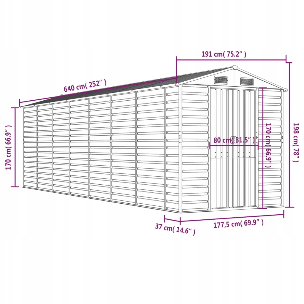 збільшуйте варіанти зберігання та закріпіть свої інструменти завдяки цьому універсальному сараю. Міцний матеріал: Інструментальна комірка була виготовлена з оцинкованої сталі, яка запобігає іржі та забезпечує її тривалому терміну експлуатації. Сталь - це надзвичайно жорсткий і сильний матеріал, який надає конструкції стабільності та міцності. Гальванізація гарантує кращий захист від корозії та корисна у випадку продуктів, які будуть використовуватися зовні та у складних умовах. Багато місця для зберігання: цей металевий сарай забезпечує багато місця для зберігання опалювальної деревини, садових інструментів, меблів, обладнання та не тільки. Практичні ручки: у дверях садових навісів є ручки, що полегшують вхід. Структура оснащена чотирма вентиляторами, що забезпечує хорошу вентиляцію та зменшує накопичення вологи в приміщенні. Структура була закохана: дах, зроблений для даху, робить воду вільно надходити над нею.