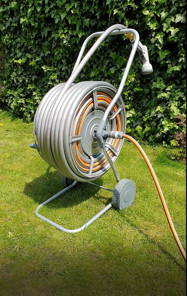 - візок може вмістити 50 метрів 4- багатошаровий садовий шланг із внутрішнім діаметром 3/4" (~19 мм), наприклад BEST GRAPHITE, як на фотографіях нижче. Латунний шланг і швидкі з’єднувачі не включені в цю пропозицію