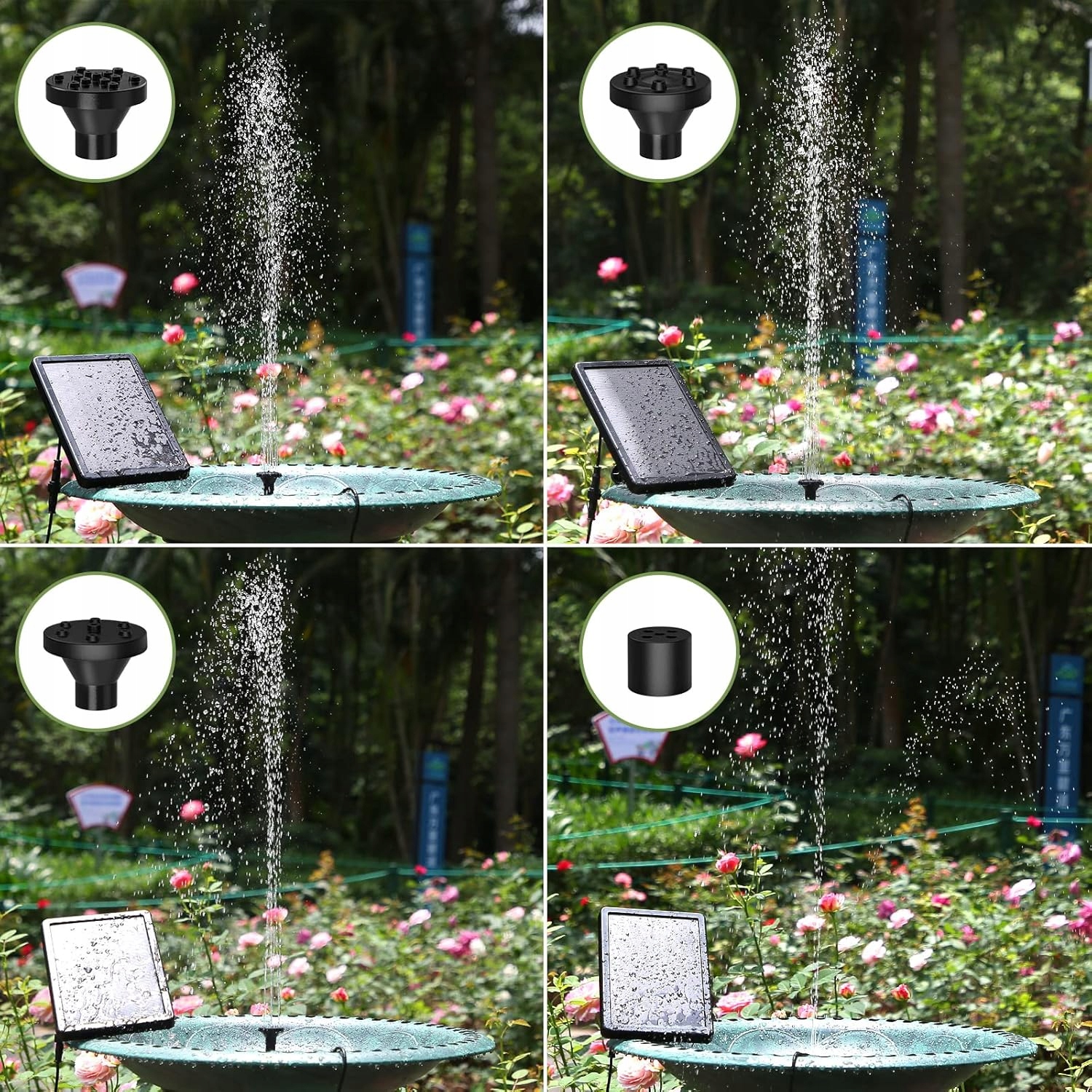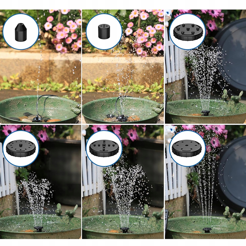 4 різні насадки можуть відповідати вашим різним вимогам щодо висоти або форми водної колони. Сильний декоративний елемент, який робить ваш садовий ставок красивішим і динамічнішим. Структура SNAP, що дозволяє легко замінити насадку. (Якщо фонтан розміщується у відносно невеликій ванті для птахів, рекомендується не встановлювати насадку, щоб уникнути витоку води з ванни для птахів).