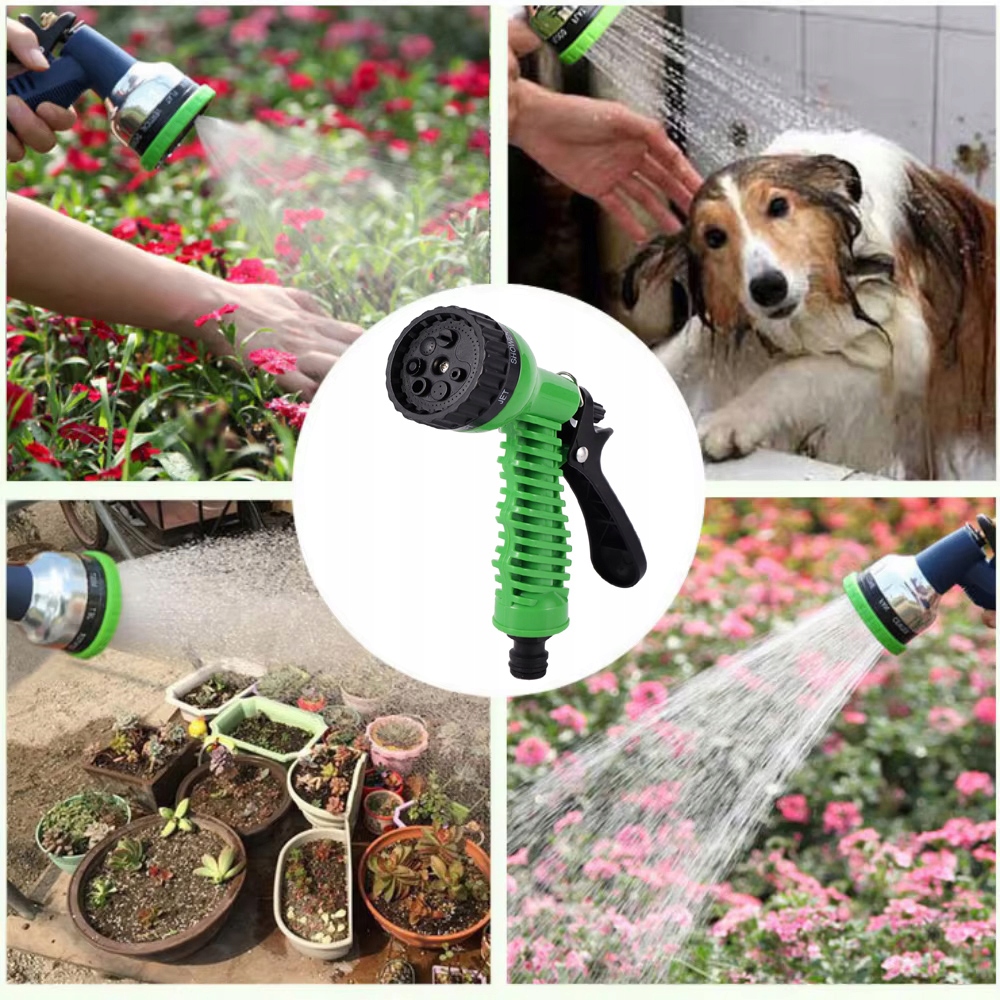 Пістолет пропонує сім різних режимів посипання, завдяки яким ви можете легко вибрати правильний режим для поточних потреб. Він ідеально підходить як для делікатного поливу рослин, так і для миття автомобіля, мощення каменів на проїжджій частині, фасад будинку або купання собаки. Просто виберіть потрібну функцію за допомогою поворотної ручки.