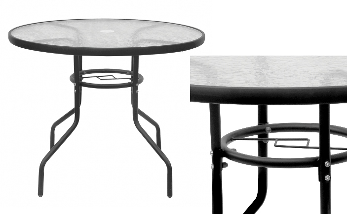 загартоване скло використовувалося для стільниці, яка стійка до незначних подряпин. Дизайн садового столу він був зроблений з сталі .