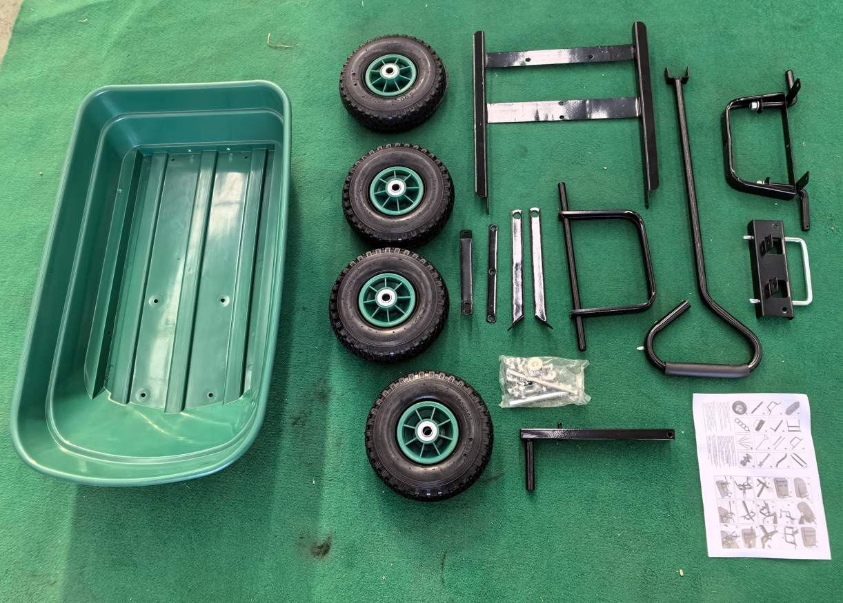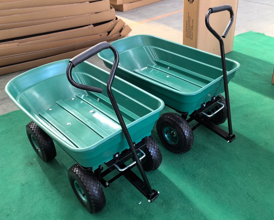 Універсальний садовий візок - його можна використовувати як візок, тачку, самоскид, транспортер і навіть причіп. Допомагає під час городніх робіт (перевезення ґрунту, листя), польових робіт (перевезення добрив, сільськогосподарської продукції) або для транспортування дров і вугілля до котельні. Коляска має 4 надувних колеса, пластикову чашу і ручку для перетягування. Він не вимагає застосування великої фізичної сили, тому може використовуватися і дітьми. Виготовлений із міцних матеріалів, дозволяє навантажувати до 120 кг.
