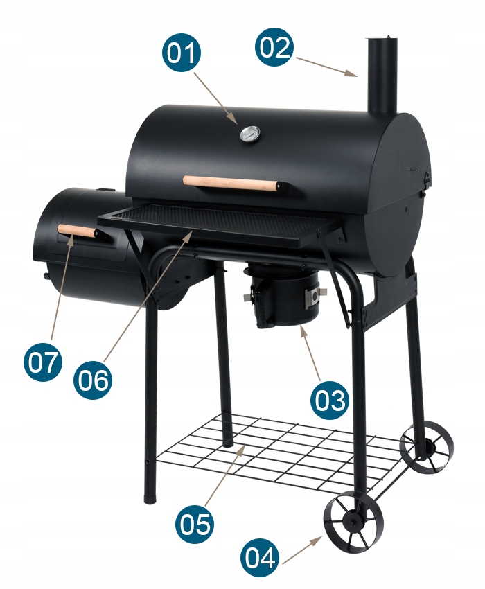 Конструкція виготовлена з чорного порошкового листового металу, може бути транспортується на колесах, а закрита зона гриля є хорошим рішенням і захистом під час грилю з дітьми.