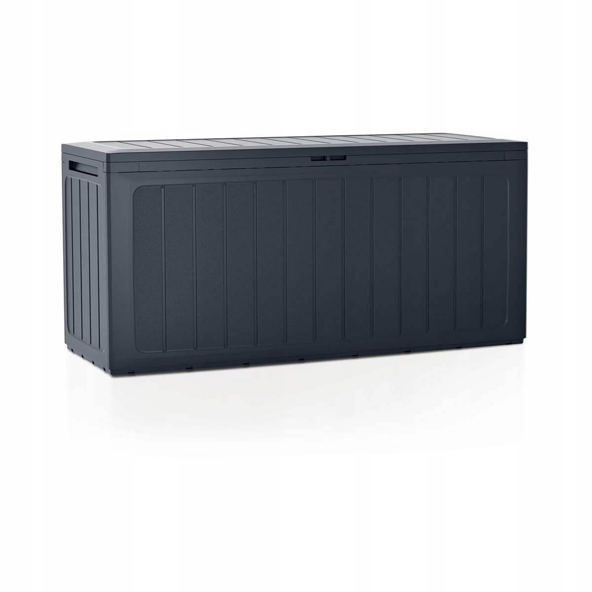 Універсальний садовий ящик з елегантним дизайном, що імітує дерево, ідеально підходить як місце для зберігання садового інструменту та подушок, а також іграшок для малюка. Виготовлений із високоякісного пластику.