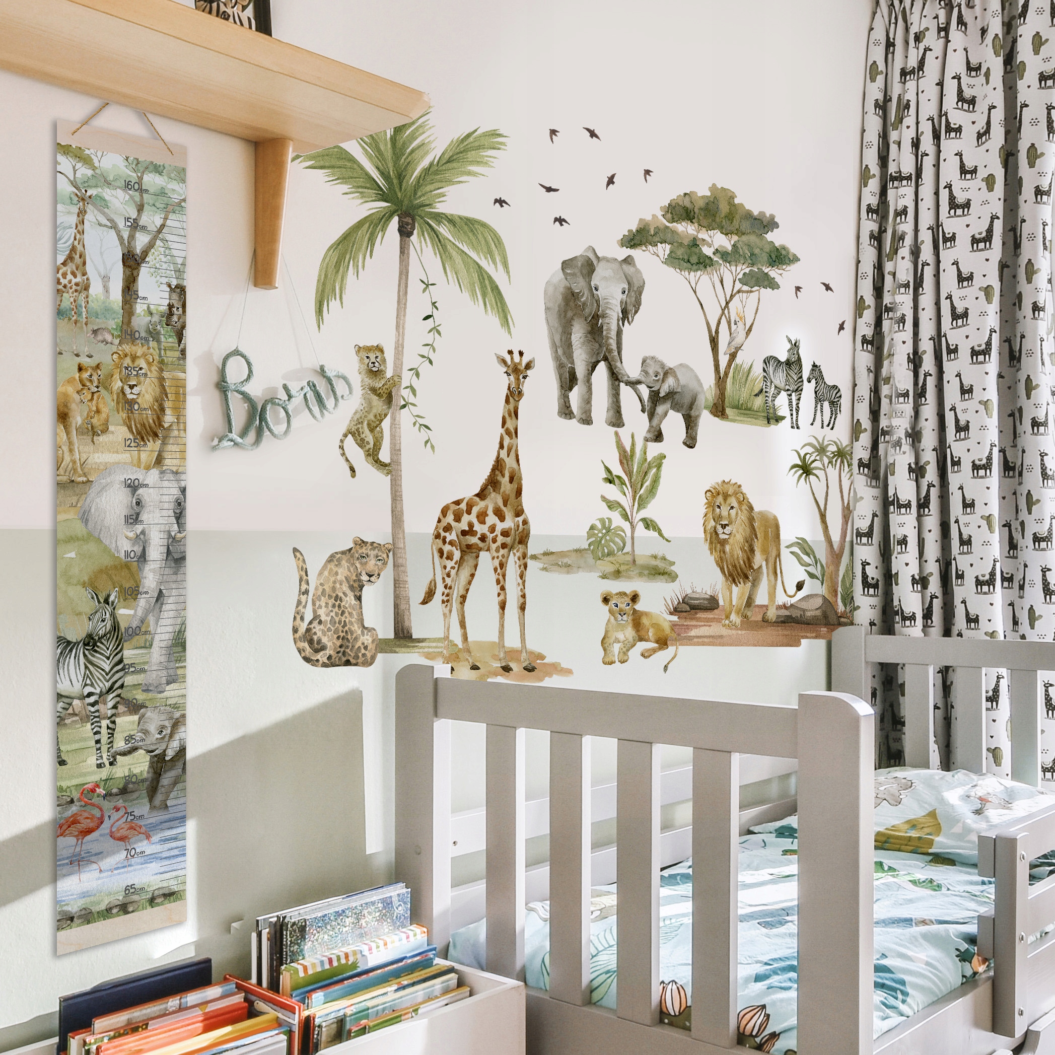 Барвисті заходи росту з дикими тваринами - це чудова прикраса для дитячої кімнати. Шаблон з мотивом сафарі сподобається кожному вентилятору тварини. Завдяки установці на рядку, прикраса може використовуватися протягом тривалого часу, ви можете вільно повісити його та видалити вчасно, наприклад. реконструкція.
