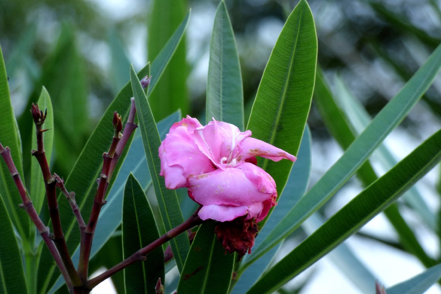 Корисна інформація: Вічнозелений деревний олеандр зі шкірястим ланцетним листям цвіте яскраво-рожево-фіолетовим кольором з червня по вересень. Як горщикова рослина досягає висоти до 3 метрів.